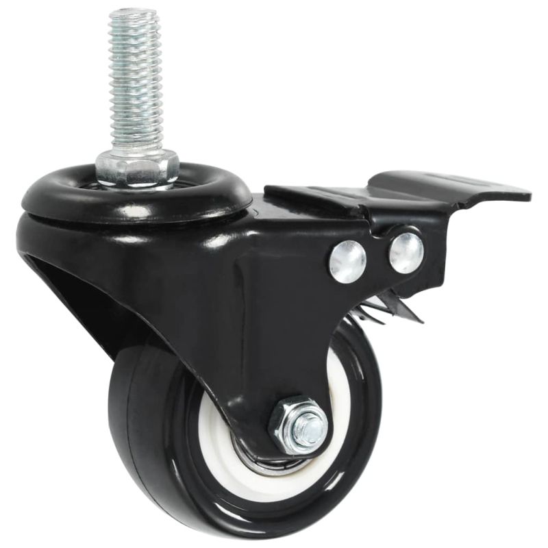 Този комплект от 24 въртящи се колелца със спирачки ще бъде перфектният аксесоар за дребно оборудване и мебели като работна маса, количка, масичка за кафе, стойка за растения, рафт за книги, пазарска количка и др. Тези колелца са изработени от PP (полипропилен), който се отличава с добра устойчивост на удар и вибрации, което позволява на колелцата да работят гладко и тихо. Освен това техните меки повърхности ефективно предпазват вашия под от надраскване. Освен това желязната рамка е силно устойчива на ръжда и по този начин допринася за здравината и издръжливостта на колелото. Освен това тези въртящи се колела са оборудвани със спирачки за гъвкаво управление. Всяко колело има максимална товароносимост до 50 кг. Доставката включва 24 въртящи се колела със спирачки.