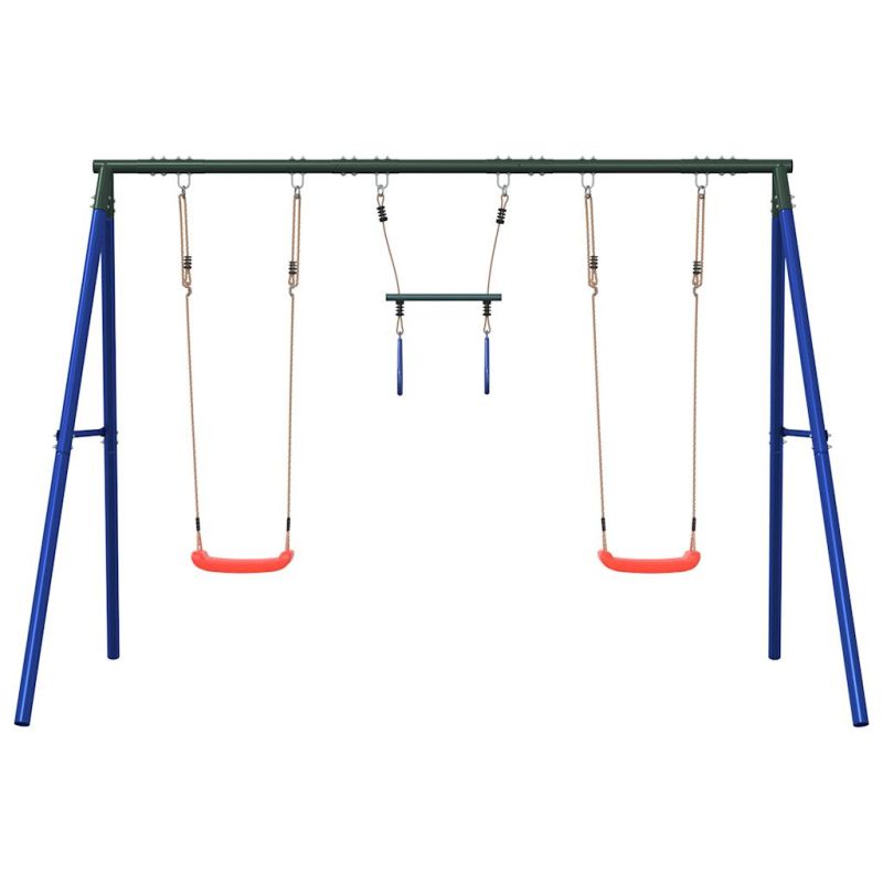 Превърнете градината си в детска площадка за вашите деца с тази външна люлка! Център за забавни занимания: Този комплект детски люлки разполага с 2 различни опции за игра с две седалки люлки и трапец с халки за гимнастика. Така децата могат да се люлеят и катерят до насита.Издръжлива метална рамка: Тази рамка за люлка е изработена от боядисани стоманени тръби, които са устойчиви на ръжда, изключително здрави и устойчиви на деформация, осигурявайки отлична стабилност и издръжливост. А-образната структура предлага здрава опора без никакво колебание.Регулируема седалка за люлка: Тази градинска люлка е проектирана да расте с вашето дете, което я прави подходяща както за малки, така и за подрастващи деца. Чрез регулиране на дължината на въжето можете лесно да се приспособите към променящите се нужди на вашето дете.Многофункционални играчки за открито за деца: Тази градинска люлка помага на децата да подобрят своя баланс, координация, ловкост, сила и издръжливост, като същевременно предоставя различни начини за игра и упражнения.Широки приложения: Тази рамка за люлка може да се постави на различни места като градини, задни дворове, детски градини, детски площадки и др. Добре е да се знае:С оглед на безопасността всяка люлка трябва да се използва само от едно дете.