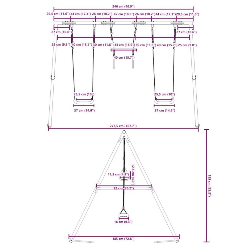 Превърнете градината си в детска площадка за вашите деца с тази външна люлка! Център за забавни занимания: Този комплект детски люлки разполага с 2 различни опции за игра с две седалки люлки и трапец с халки за гимнастика. Така децата могат да се люлеят и катерят до насита.Издръжлива метална рамка: Тази рамка за люлка е изработена от боядисани стоманени тръби, които са устойчиви на ръжда, изключително здрави и устойчиви на деформация, осигурявайки отлична стабилност и издръжливост. А-образната структура предлага здрава опора без никакво колебание.Регулируема седалка за люлка: Тази градинска люлка е проектирана да расте с вашето дете, което я прави подходяща както за малки, така и за подрастващи деца. Чрез регулиране на дължината на въжето можете лесно да се приспособите към променящите се нужди на вашето дете.Многофункционални играчки за открито за деца: Тази градинска люлка помага на децата да подобрят своя баланс, координация, ловкост, сила и издръжливост, като същевременно предоставя различни начини за игра и упражнения.Широки приложения: Тази рамка за люлка може да се постави на различни места като градини, задни дворове, детски градини, детски площадки и др. Добре е да се знае:С оглед на безопасността всяка люлка трябва да се използва само от едно дете. Предупреждение. Не е подходящ за деца под 3 години. Само за домашна употреба. GPSR