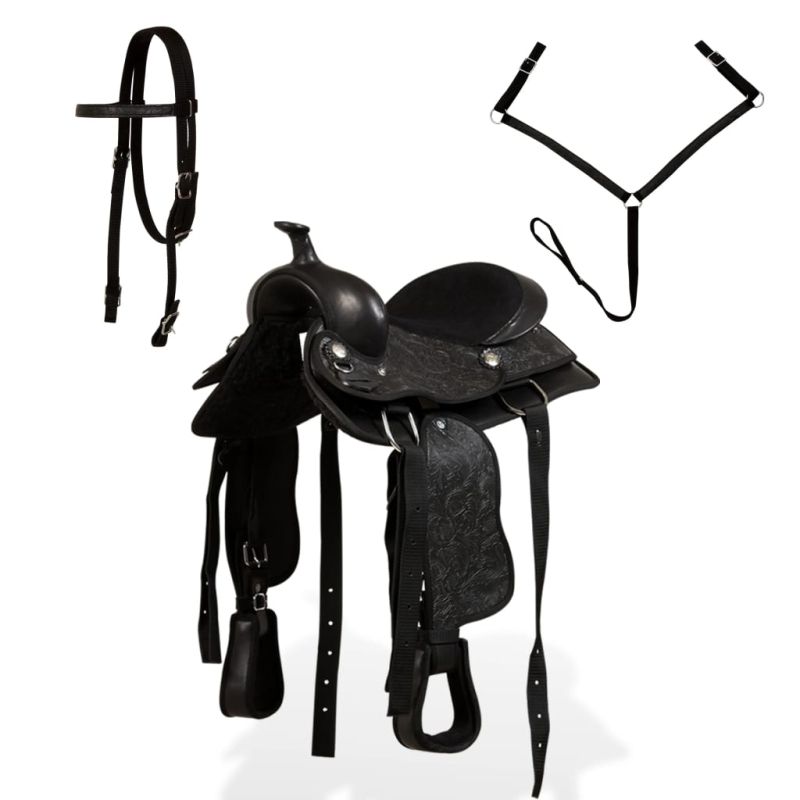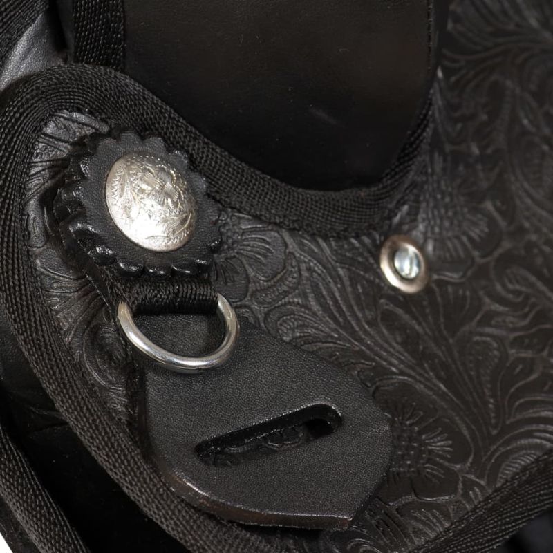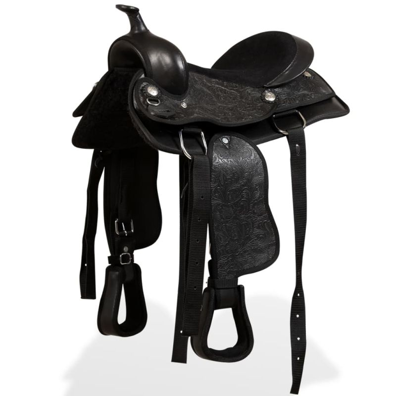 Това уестърн седло се доставя с подходящ оглавник и опас. Висококачествена естествена кожа и изкуствена кожа, декорирана с флорални релефи, правят седлото декоративно, както и функционално. Уестърн седлото е подсилено във всички точки на натоварване за допълнителна издръжливост. Кожените стремена са здрави и износоустойчиви, както и ремъкът на юздата и подпръгът. Това уестърн седло е много удобно, така че конят и ездачът могат да прекарат дълги часове в езда на открито.