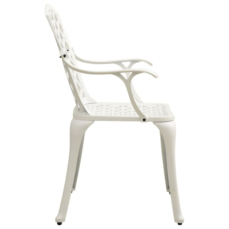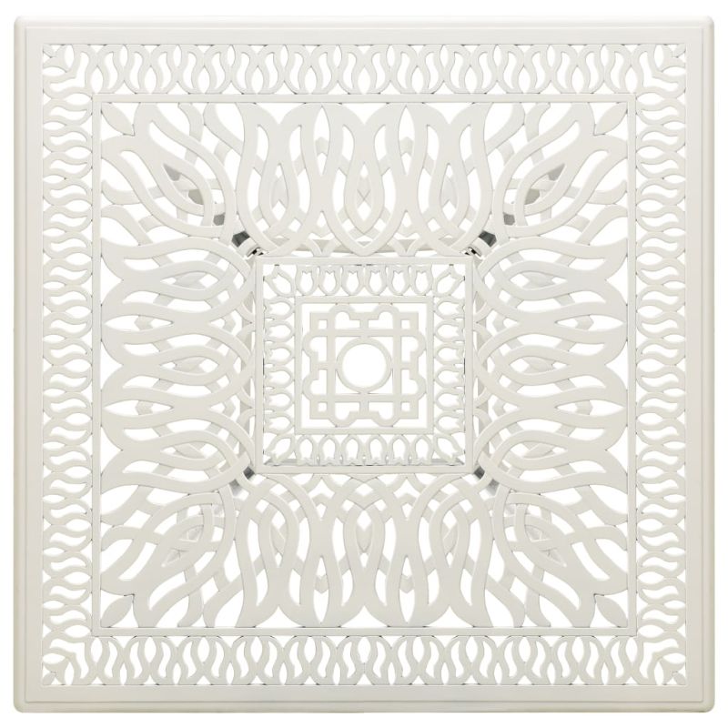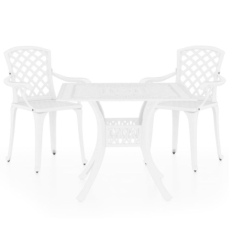 Този бистро комплект, изработен от лят алуминий, осигурява удобно преживяване при седене за вас и вашите гости. Градинските столове и маса, изработени от алуминий, са здрави и издръжливи. Устойчивият на ръжда и на атмосферни влияния материал прави комплекта мебели идеален за използване на открито. Красивите шарки правят бистро комплекта елегантно допълнение към вашето външно пространство. Освен това масичката за кафе има отвор за чадър, който може перфектно да побере чадъра ви, за да ви предпази от слънце или дъжд. Забележка: За да удължите живота на вашите градински мебели, препоръчваме ви да ги почиствате редовно и да не ги оставяте ненужно на открито без защита.Почистване: Използвайте мек сапунен разтворСъхраняване: Ако е възможно, съхранявайте на хладно и сухо място на закрито. Ако продуктът се съхранява на открито, защитете го с водоустойчиво покривало. Избършете и изсушете излишната вода или сняг от плоските повърхности след дъжд или снеговалеж. Позволете достатъчно циркулация на въздуха, за да избегнете повреди, свързани с влагата. Максимално 110 кг на седалка.
