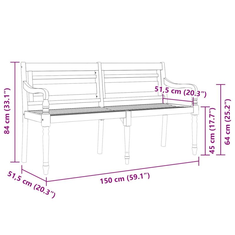Добавете елегантен щрих към вашето външно жилищно пространство с тази дървена пейка Батавия с възглавница! Естествено тиково дърво: Масивната тикова дървесина е красив естествен материал. Тя е обветрена, изсушена в пещ и след това фино шлифована, за да ѝ се придаде много гладък вид. Тиковото дърво е известно със своята изключителна здравина и устойчивост на атмосферни влияния.Практичен материал: Тъканта се отличава със семпъл и изчистен вид, като е дишаща и издръжлива.Удобно седене: Пейката разполага с подлакътници и облегалка с включена възглавница, осигурявайки удобно изживяване при седене.Стилен дизайн: Изящната пейка с дърворезба ще добави нотка на рустик чар към вашата градина и е много подходяща за почивка на открито заедно с вашите приятели и семейство. Забележка:Всеки продукт се доставя с ръководство за сглобяване в кашона за лесно сглобяване.Забележка: За да удължите живота на вашите градински мебели, ви препоръчваме да ги защитите с водоустойчиво покривало. Максимално 110 кг на седалка. Съобразете се с риска от открит огън и други източници на силна топлина в близост до продукта.