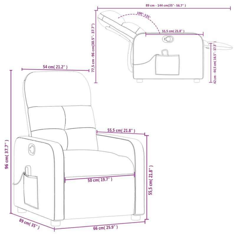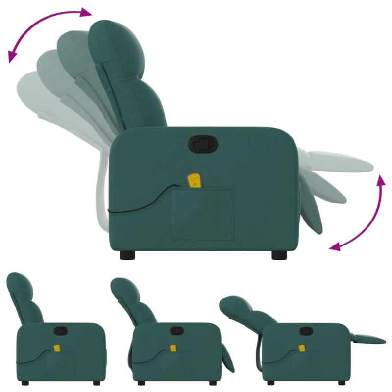 Облегнете се и се отпуснете в този изключително комфортен масажен наклоняем стол! Функция за ръчно накланяне: Този накланящ се стол има дръжка от дясната страна. Можете ръчно да настроите поставката за крака и облегалката до произволна позиция според вашето удобство с просто издърпване на дръжката. Тази функция позволява максимален наклон от 135 градуса. Освен това облегалката може бързо да се върне на първоначалното си място с лесно издърпване на дръжката.Функция за вибрация: Представените 6 масажни точки ви позволяват да изпитате по-целенасочен масаж. Освен това включеното ръчно управление ви позволява да избирате различни програми за масаж. Функцията за масаж се захранва от USB конектора, но сертифицираният 5V USB източник на захранване не е включен.Удобно седене: Дебело подплатената седалка, облегалката и широките подлакътници, покрити с текстил, осигуряват уютно и топло усещане, което ви кара да се чувствате като в прегръдка, докато седите. Тъканта се отличава със семпъл и изчистен вид и е дишаща и издръжлива.Удобен страничен джоб: Този фотьойл има страничен джоб за вашето дистанционно управление или за поддържане на вашите основни вещи леснодостъпни.Здрава и стабилна рамка: Рамката, изработена от дърво и метал, осигурява здрава структура и стабилност. Този накланящ се фотьойл е удобен и издръжлив. Съобразете се с риска от открит огън и други източници на силна топлина в близост до продукта. Максимално 110 кг на седалка. Този продукт се захранва от DC 5V, но сертифицираният USB източник на захранване 5V не е включен в комплекта. По-високото напрежение може да доведе до прегряване на устройството и да доведе до повреда на устройството и потенциален риск от прегряване и пожар.