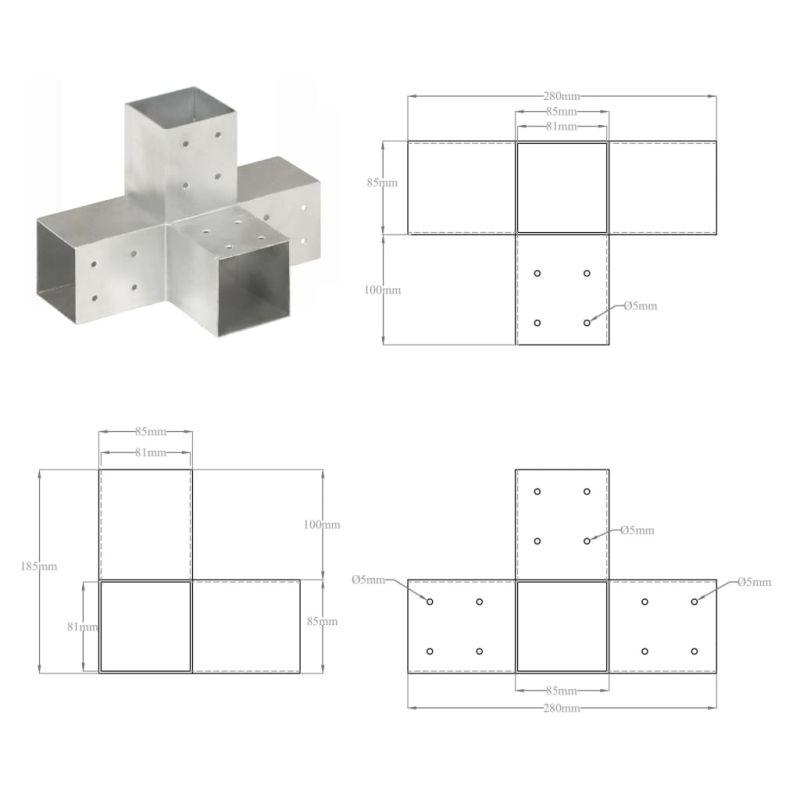 Нашите конектори за греди ви позволяват да проектирате и конструирате ваши собствени конструкции от греди в градини или места, като навеси и беседки на открито. Електропоцинкованият конектор може лесно и стабилно да свърже гредите. Всички конектори са предварително пробити. Тази планка за дървени греди е за 4 квадратни дървени греди от 81 мм. Забележка: Доставката не включва винтове и монтажни материали.