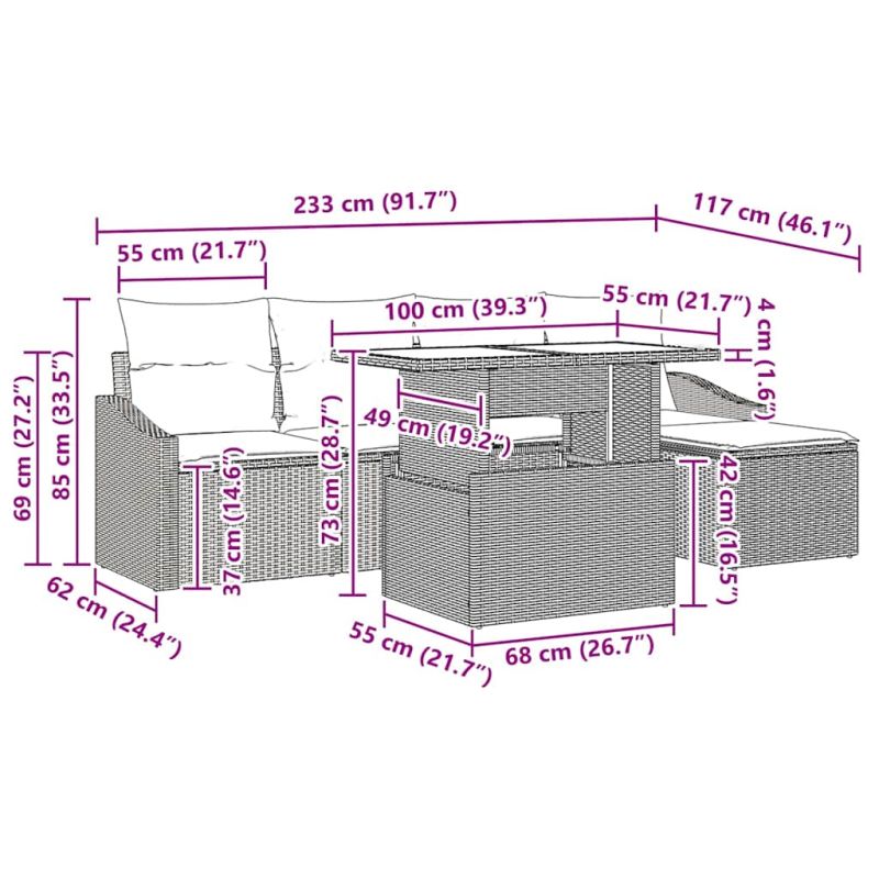 Този модерен комплект градински софи е проектиран за удобство и многофункционалност, идеален за създаване на модерен кът в градината или на терасата. Представете си как с този комплект можете да адаптирате пространството спрямо нуждите си - независимо дали каните приятели за лятно парти или просто искате да се насладите на спокойно време сред природата. Минималният му вид предлага стил и комфорт, без да изисква много поддръжка. Премиум материал полиратан: Комплектът е изработен от качествен полиратан, който е здрав и устойчив на UV лъчи, което осигурява дълготрайност и запазва цвета му дори под слънчевата светлина. Комфортна конструкция: Всеки елемент, включително креслата и централните седалки, е проектиран с удобство. Ъгловите подлакътници осигуряват отлична поддръжка, а седалките имат меки възглавници за допълнително удобство. Функционални характеристики: Модулният дизайн позволява пренареждане, а лека конструкция ги прави лесни за местене. Закаленото стъклено масичка е практично допълнение за напитки и декор. Идеални приложения: Перфектен за пролетните и летните месеци, комплектът е чудесен за тераси и градини, предоставяйки приятно място за семейни събирания или релаксиращи моменти сам. Лесна поддръжка: Защитните покрития удължават живота на комплекта, а редовното почистване на възглавниците помага да запазите добрия вид.