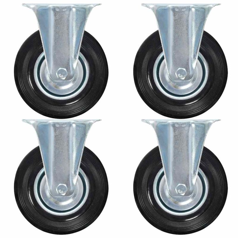 Този комплект от 4 фиксирани колела ще бъде идеалният аксесоар за малко оборудване и мебели като работна маса, количка, масичка за кафе, поставка за растения, рафт за книги, количка за пазаруване и др. Тези колелца са изработени от гума, която се отличава с добра устойчивост на удар и вибрации, което позволява на колелцата да работят гладко и тихо. Освен това техните меки повърхности ефективно предпазват вашия под от надраскване. Освен това желязната рамка с поцинковано покритие е силно устойчива на ръжда и по този начин допринася за здравината и издръжливостта на колелцата. Всяко колело има максимална товароносимост до 100 кг. Доставката включва 4 фиксирани колела.