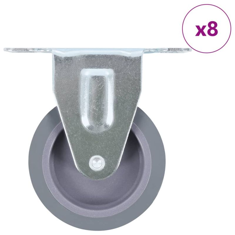 Този комплект от 8 фиксирани колела ще бъде идеалният аксесоар за малко оборудване и мебели като работна маса, количка, масичка за кафе, поставка за растения, рафт за книги, количка за пазаруване и др. Тези колелца са изработени от TPR (термопластична гума), която се отличава с добра устойчивост на удар и вибрации, което позволява на колелцата да работят гладко и тихо. Освен това техните меки повърхности ефективно предпазват вашия под от надраскване. Освен това желязната рамка с поцинковано покритие е силно устойчива на ръжда и по този начин допринася за здравината и издръжливостта на колелцата. Всяко колело има максимална товароносимост до 45 кг. Доставката включва 8 фиксирани колела.