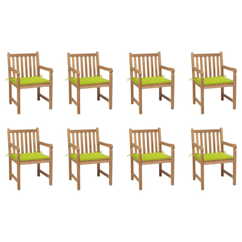 Градински столове, 8 бр, с яркозелени възглавници, тик масив
