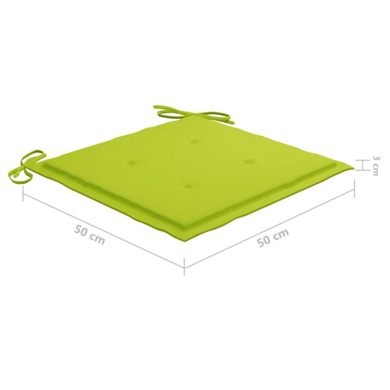 Добавете щрих на рустик чар към вашата трапезария, градина или вътрешен двор с този комплект стифиращи градински столове с възглавници! Този комплект трапезни столове ще извиси вашето вътрешно или външно жилищно пространство със своя елегантен ламелен дизайн. Комплектът мебели от тик е изработен от изключително издръжлива тикова твърда дървесина, която е суха – изсушена в пещ и фино шлифована, за да ѝ се придаде много гладък вид. Тиковото дърво е известно с изключителната си здравина и устойчивост на атмосферни влияния, което го прави далеч по-подходящо за градински мебели от всеки друг вид дърво. Тиковата дървесина е идеалният избор, ако искате да закупите дълготрайна градинска мебел. Лесно се поддържа и почиства с влажна кърпа. Освен това трапезните столове се подреждат един върху друг, за да се пести място за съхранение, когато не се използват. Нещо повече, включените възглавници осигуряват допълнителен комфорт. Всяка възглавница има 2 комплекта връзки, за да я фиксирате плътно към стола. Забележка: За да удължите живота на вашите градински мебели, препоръчваме ви да ги почиствате редовно и да не ги оставяте ненужно на открито без защита.Почистване: Използвайте мек сапунен разтворСъхранение: Ако е възможно, съхранявайте на хладно и сухо място на закрито. Ако продуктът се съхранява на открито, защитете го с водоустойчиво покривало. Избършете и изсушете излишната вода или сняг от плоските повърхности след дъжд или снеговалеж. Позволете достатъчно циркулация на въздуха, за да избегнете повреди, свързани с влагата. Максимално 110 кг на седалка.