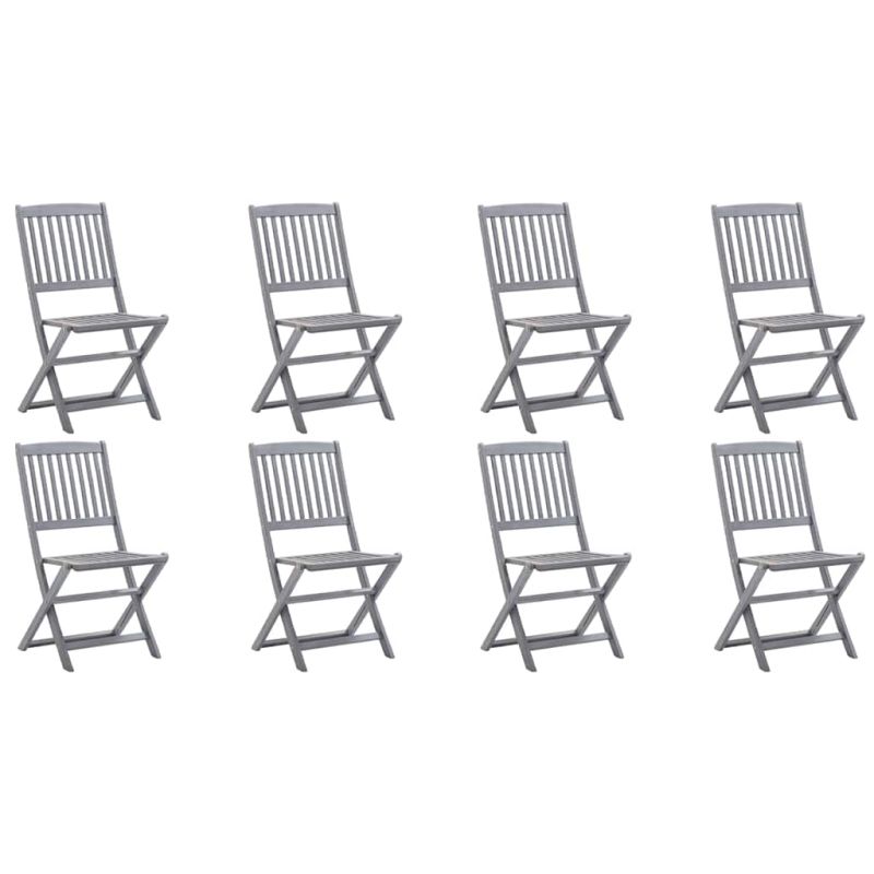Този модерен комплект дървени трапезни столове с възглавници ще добави щрих на естествен стил към градината, терасата или вътрешния двор. Този комплект сгъваеми столове ще бъде чудесен избор за вечеря. Трапезните столове са изработени от масивно акациево дърво – тропическа твърда дървесина, която ги прави устойчиви на атмосферни влияния и издръжливи за дългогодишна употреба. Масивната акациева дървесина има силата да понесе тежестта и да издържи на износването на времето. Сивата избелена повърхност се почиства лесно с влажна кърпа. Столовете могат да се сгъват, за да пестят място, когато не се използват. Освен това включените възглавници осигуряват допълнителен комфорт при почивка или хранене. Всяка възглавница разполага с два комплекта връзки за плътно закрепване към стола. Забележка: За да удължите живота на вашите градински мебели, препоръчваме ви да ги почиствате редовно и да не ги оставяте ненужно на открито без защита.Почистване: Използвайте мек сапунен разтворСъхранение: Ако е възможно, съхранявайте на хладно и сухо място на закрито. Ако продуктът се съхранява на открито, защитете го с водоустойчиво покривало. Избършете и изсушете излишната вода или сняг от плоските повърхности след дъжд или снеговалеж. Осигурете достатъчно циркулация на въздух, за да избегнете повреди, свързани с влагата. Максимално 110 кг на седалка.