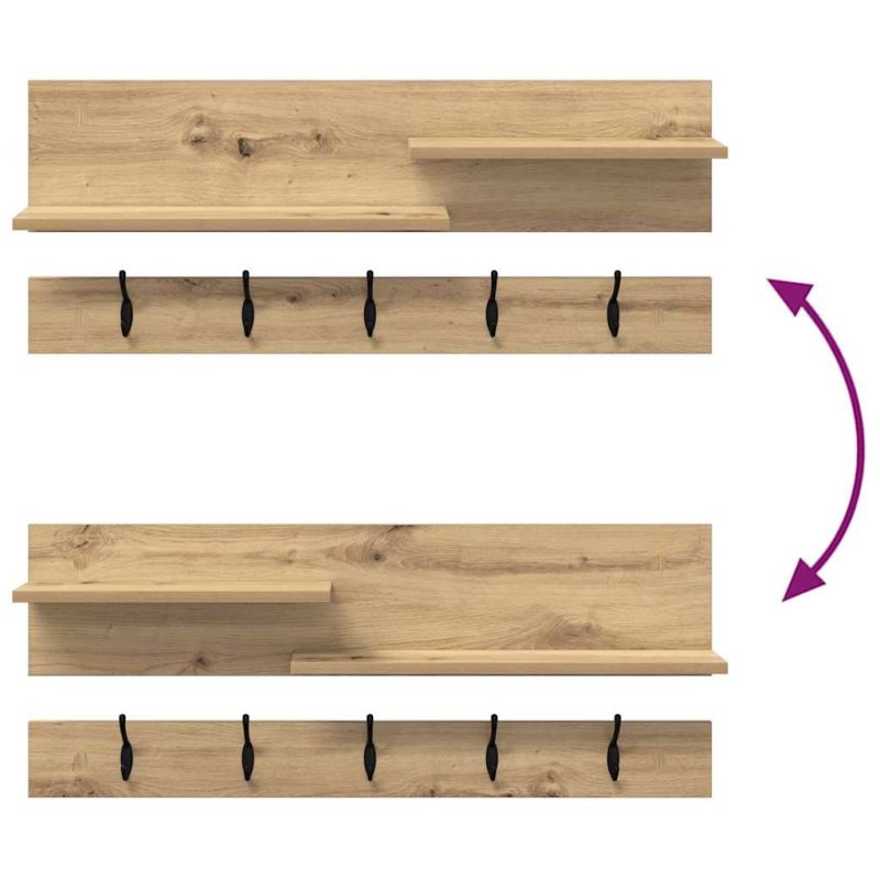 Тази стенна закачалка за палта е много стилна и е чудесен елемент за съхранение. С минималистичния си дизайн, тя съчетава практичност и мода. Има куки и рафтове, които ще помогнат да организирате входа си и да задържите всичко на мястото му. Идеална е за коридори и стаи, добавяйки стил на всяко място. Инженерна дървесина: Изработена от здрава инженерна дървесина, тази закачалка е здравa и модерна. Материалът е избран заради издръжливостта и гладкото си покритие, идеален за съвременни интериори. Куки и рафтове: Множество куки за палта, шапки и шалове, плюс допълнителни рафтове за ежедневни вещи - всичко на ръка. Лесен монтаж: Монтира се просто на стената, спестявайки подово пространство и придавайки подреден вид на интериора. Препоръчва се за вътрешна употреба: Идеална е за коридори и входове, добавя удобство и стил. Изисква сглобяване: Лесно се сглобява с помощта на отвертка, с ясни инструкции за безпроблемен процес.