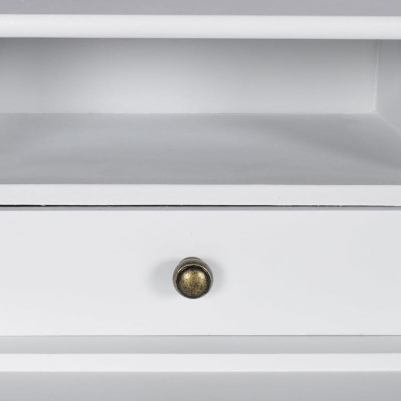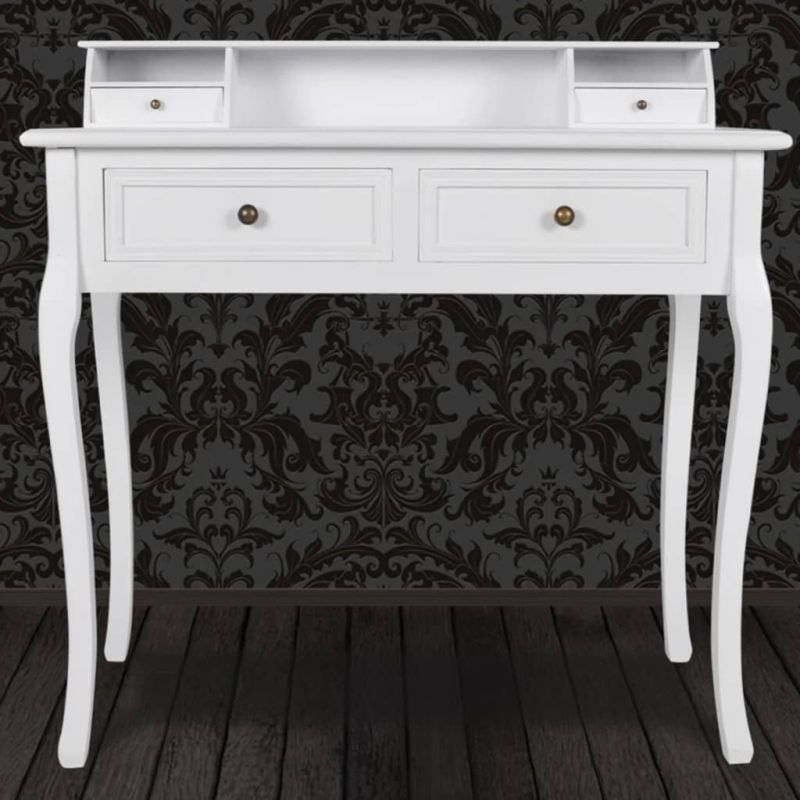 Тази красива тоалетна масичка ще украси вашата спалня или гардеробна! Има две горни чекмеджета от всяка страна, където може да съхранявате вашите ценности. В допълнение, двете по-големи чекмеджета в долната част на масата предоставят допълнително място за съхранение. Чекмеджетата могат да се вадят и са лесни за почистване. Мекият бял завършек и извитите крака придават блясък и класа на тази впечатляваща мебел. Проверете и останалите продукти, които предлагаме за подходящи табуретка и огледало към масичката! Моля, отбележете, че тъй като тази мебел е ръчно изработена от дърво и боядисана в бяло, би могло да има лек дефект.