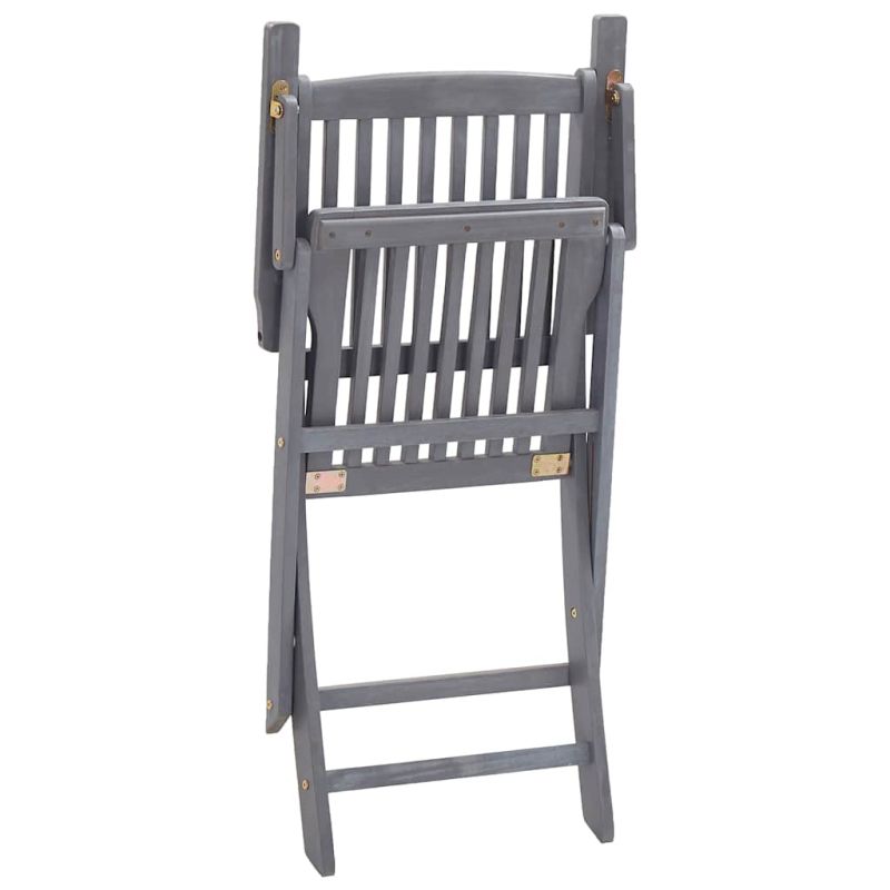 Този модерен комплект дървени трапезни столове с възглавници ще добави щрих на естествен стил към градината, терасата или вътрешния двор. Този комплект сгъваеми столове ще бъде чудесен избор за вечеря. Трапезните столове са изработени от масивно акациево дърво – тропическа твърда дървесина, която ги прави устойчиви на атмосферни влияния и издръжливи за дългогодишна употреба. Масивната акациева дървесина има силата да понесе тежестта и да издържи на износването на времето. Сивата избелена повърхност се почиства лесно с влажна кърпа. Столовете могат да се сгъват, за да пестят място, когато не се използват. Освен това включените възглавници осигуряват допълнителен комфорт при почивка или хранене. Всяка възглавница разполага с два комплекта връзки за плътно закрепване към стола. Максимално 110 кг на седалка.
