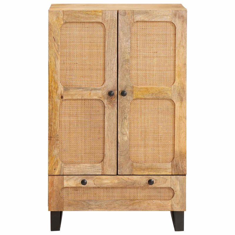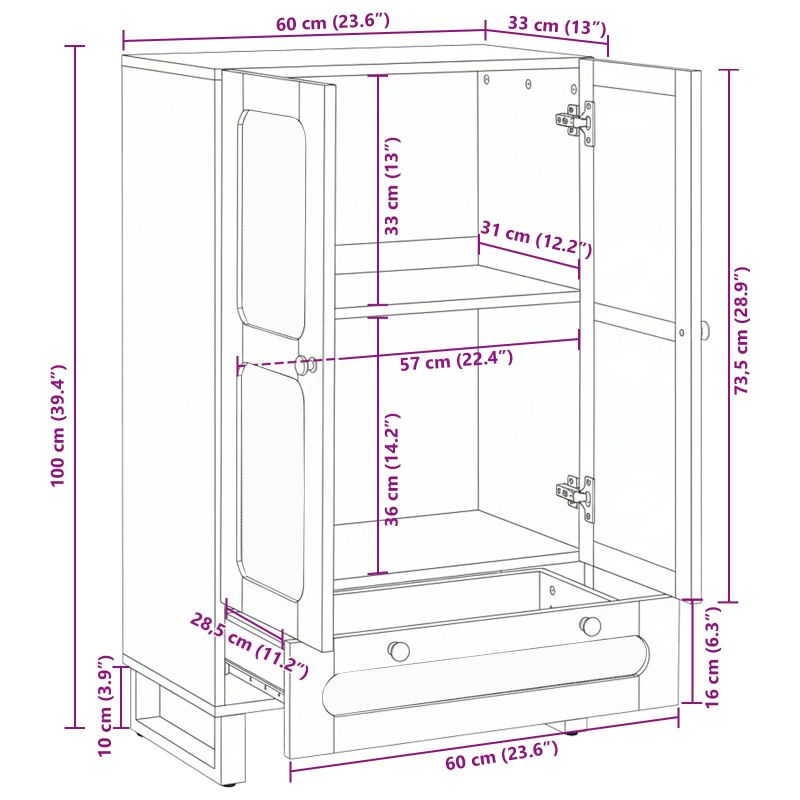Тази съвременна висока секция е елегантна добавка за всяка трапезария или всекидневна. С изчистени линии и минималистичен стил, тя съчетава красота с функционалност, предоставяйки уникална текстура, която може да съхранява, показва и подобрява декора на дома. Красивата кафява повърхност се вписва идеално в разнообразни интериори, създавайки топла и приветлива атмосфера. Материали: Направена от масивно мангово дърво и инженерна дървесина, тази секция предлага стилна комбинация с естествена естетика. Манговото дърво дава богата текстура, а инженерните елементи гарантират добро качество и цена. Осигуряват надеждност при интензивна употреба, за да съхраняват вещите ви красиво и безопасно. Включени компоненти: Има вентилирани врати и сменяеми рафтове, които предлагат широки възможности за съхранение. Вратите са с удобни дръжки за лесна работа, а квадратните метални крака осигуряват стабилност. Всеки компонент предлага практични и стилни решения за съхранение. Характеристики/функция/дизайн: С заден панел от здрав MDF, секцията е устойчива на ежедневна употреба. Правоъгълната форма лесно се вписва в стените, оптимизирайки пространството без да нарушава движението в помещението. Стилният дизайн е на ниво, подходящ за съвременни интериори. Препоръчвани приложения: Идеална за трапезарии или всекидневни, секцията е супер подходяща като бюфет или витрина. Универсалността ѝ я прави идеална за всякакви декоративни или функционални нужди, независимо дали става въпрос за посуда, текстил или любими снимки. Грижи и поддръжка: Поддържайте перфектния вид, като редовно почиствате с суха кърпа. Избягвайте агресивни химии, за да запазите естественото покритие. Когато е необходимо, по-интензивната грижа гарантира дълготрайност и привлекателност на продукта, запазвайки го страхотен елемент в продължение на години.