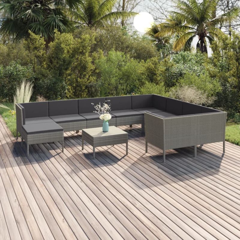 Градински комплект с възглавници, 11 части, полиратан, сив