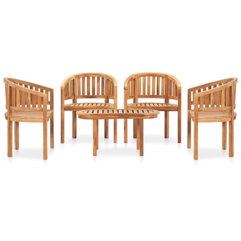 Създайте релаксираща дневна зона с този съвременен дървен градински лаундж комплект. Този комплект градински мебели е изработен от изключително издръжлива тикова твърда дървесина, която е суха – изсушена в пещ и фино шлифована, за да ѝ се придаде много гладък вид. Тиковото дърво е известно с изключителната си здравина и устойчивост на атмосферни влияния, което го прави далеч по-подходящо за градински мебели от всеки друг вид дърво. Тиковата дървесина е идеалният избор, ако искате да закупите дълготрайна градинска мебел. Масата за открито е със здрав плот в ламелен дизайн. В допълнение, дизайнът с форма на банан на столовете придава допълнителна красота на този лаундж комплект. Максимално 110 кг на седалка.