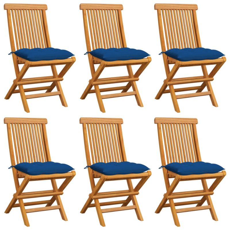 Градински столове със сини възглавници 6 бр тиково дърво масив