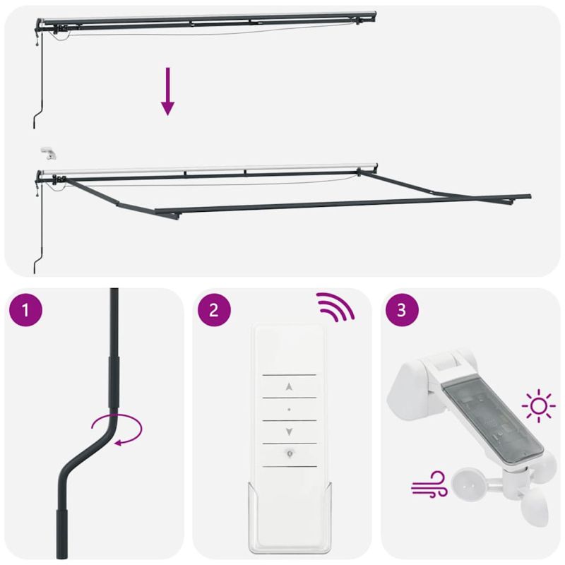 Създайте хубаво и прохладно място във вашия двор и се предпазете от ултравиолетовите лъчи с тази прибираща се тента! Издръжлив материал: Рамката на сенника е изработена от прахово боядисан алуминий, който е здрав и издръжлив. Тъканта с PU повърхностна обработка е UV устойчива. Тя ще предпази вашето семейство или гости от UV лъчи и ослепителна слънчева светлина.Автоматична функция: Можете лесно да отваряте и прибирате тентата чрез включеното дистанционно управление.Лесен за работа: Ъгълът и височината могат да се регулират, за да отговорят на вашите различни нужди. Можете да отваряте и прибирате тентата плавно с дългата манивела.LED светлини и сензор за вятър: Интегрираните LED светлини на тентата осветяват вашето външно жилищно пространство и създават уютна и романтична атмосфера, когато слънцето залезе. Тя също е снабдена със сензор за вятър, който може автоматично да затвори сенника ви през дните със силен вятър.Широки приложения: Прибиращата се тента се отличава с прост, стилен дизайн, който ще се слее добре с вашия дом или търговски обекти. Подходящ е за различни места, като тераси, вътрешни дворове, ресторанти, кафенета, магазини и др. Децата трябва да бъдат наблюдавани, за да се гарантира, че няма да си играят с уреда. Пазете децата далеч от зоната за сглобяване.Внимание: Прочетете внимателно инструкциите преди употреба и ги запазете за по-нататъшни справки.