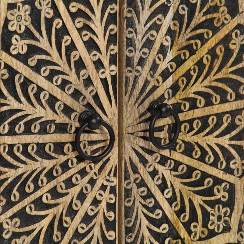 Този класически висок шкаф е предназначен да бъде декоративно и практично допълнение към вашия дом. Масивна мангова дървесина: Масивната дървесина от манго е здрава тропическа дървесина, от която се произвеждат здрави мебели. Красивите ѝ дървесни шарки правят всяка мебел малко по-различна от следващите. Изработен от масивно мангово дърво, шкафът е издръжлив и стабилен.Достатъчно място за съхранение: Бюфетът предоставя достатъчно място за съхранение, където да държите различни вашите вещи добре организирани и леснодостъпни.Практична врата: Поддържайте реда в помещението, като скриете дребните неща зад вратичките на този шкаф.Здрави крака: Железните крака добавят здравината и стабилността на страничния шкаф.Ретро стил: Този шкаф за съхранение с ръчно издълбани флорални шарки внася лукса на ретро стила във вашия интериор, като е централната точка на вашата стая. Добре е да се знае:Всеки артикул е уникален с вариации в цветове и зърна. Доставката е на случаен принцип, което гарантира ексклузивността и индивидуалността на вашия продукт. Внимание:За да предотвратите преобръщане, този продукт трябва да се използва с предоставеното устройство за закрепване на стена.