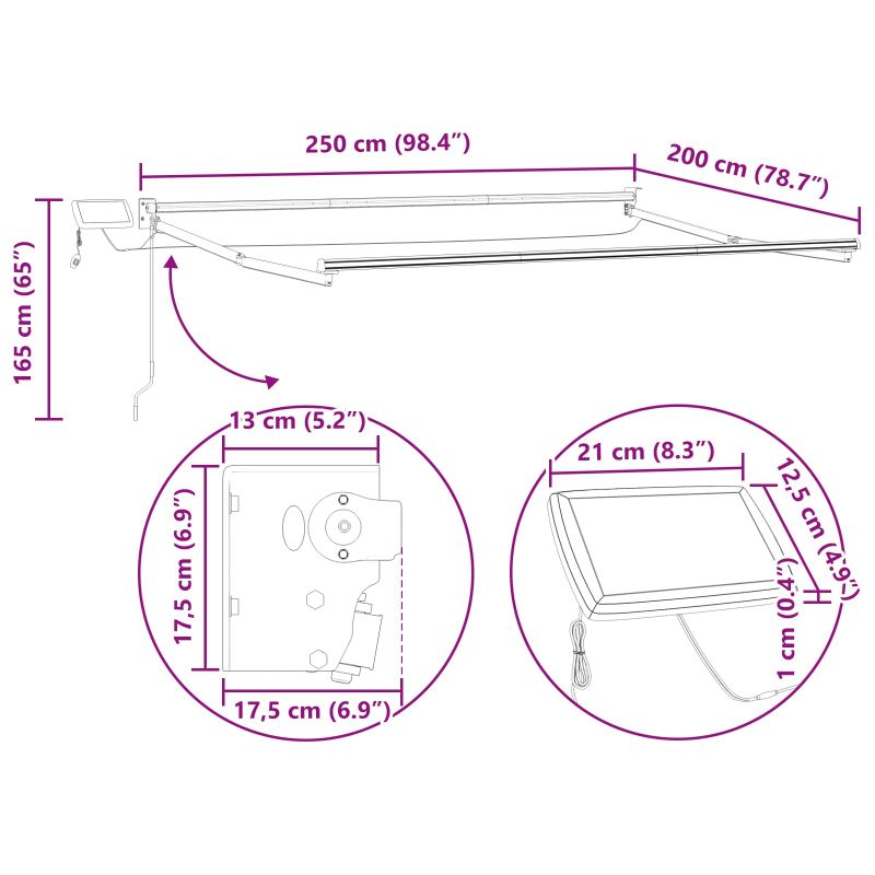 Този ръчен сенник с LED светлини на соларни батерии прави сянка и осветление за тераси, градини и всякакви открити пространства. Може да го нагласите както искате, а соларните LED светлини осветяват всичко вечер, без нужда от контакти. Водоустойчив плат: Изработен е от полиестер с ПУ покритие, за да е устойчив на слънчевата светлина и дъжда. Идеален за често ползване навън! Здрава рамка: Рамката е стоманена и алуминиева, което ѝ дава стабилност, а материалите са устойчиви на корозия. Качеството на конструкцията е на високо ниво! Ръчно управление: Сенникът идва с ръчна дръжка за разтягане и прибирате на сенника, позволявайки ви да регулирате сянката според слънцето. Соларно LED осветление: Има соларни LED лампи, които зареждат през деня за осветление вечер, без нужда от допълнителни захранващи устройства. Инсталационни компоненти: Включен е всичко нужно за поставянето. Следвайте инструкциите и ще го монтирате бързо и сигурно.