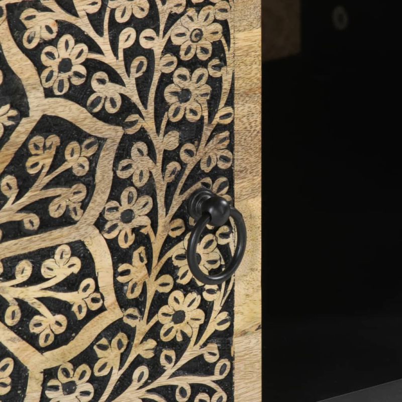 Добавете нотка елегантност към вашия хол с тази стилна масичка за кафе. Масивна мангова дървесина: Масивната дървесина от манго е здрава тропическа дървесина, от която се произвеждат здрави мебели. Красивите ѝ дървесни шарки правят всяка мебел малко по-различна от следващите. Изработена от масивно мангово дърво, страничната маса е издръжлива и стабилна.Достатъчно място за съхранение: Тази холна масичка предлага достатъчно място за съхранение, където да държите вашите принадлежности добре организирани и подръка.Стабилен плот: Здравият плот на холната маса е идеален и за поставяне на вашите напитки, храна и други декоративни елементи.Практична врата: Запазете вещите си от прах, като ги скриете зад вратата на тази маса за диван.Железни крака: Железните крака добавят спокоен стил към вашия интериор, като същевременно осигуряват стабилност.Ретро стил: Тази холна маса с ръчно издълбани флорални шарки внася лукса на ретро стила във вашия интериор, като е централната точка на вашата стая. Добре е да се знае:Всеки артикул е уникален с вариации в цветове и зърна. Доставката е на случаен принцип, което гарантира ексклузивността и индивидуалността на вашия продукт.
