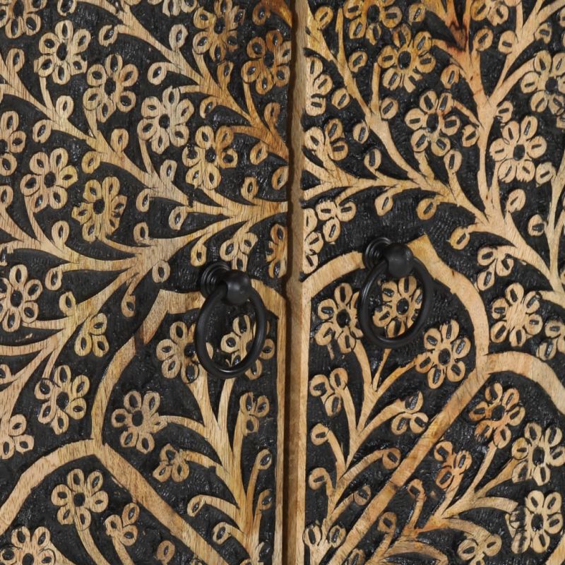 Този страничен шкаф, отличаващ се с непреходен външен вид, е предназначен да бъде отлично допълнение към вашия дом. Масивна мангова дървесина: Масивната дървесина от манго е здрава тропическа дървесина, от която се произвеждат здрави мебели. Красивите ѝ дървесни шарки правят всяка мебел малко по-различна от следващите. Изработен от масивно мангово дърво, шкафът е издръжлив и стабилен.Достатъчно място за съхранение: Шкафът предоставя достатъчно място за съхранение, където да държите различни ваши вещи добре организирани и леснодостъпни.Декоративна функция: Плотът на този шкаф за съхранение е чудесен за поставяне на вашите декоративни предмети, фотоалбуми или малки растения.Здрави крака: Железните крака добавят здравината и стабилността на страничния шкаф.Ретро стил: Този домашен органайзер с ръчно издълбани флорални шарки внася лукса на ретро стила във вашия интериор, като е централната точка на вашата стая. Добре е да се знае:Всеки артикул е уникален с вариации в цветове и зърна. Доставката е на случаен принцип, което гарантира ексклузивността и индивидуалността на вашия продукт. Внимание:За да предотвратите преобръщане, този продукт трябва да се използва с предоставеното устройство за закрепване на стена.