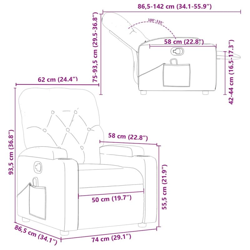 Облегнете се и се отпуснете в този изключително комфортен масажен наклоняем стол! Функция за ръчно накланяне: Този накланящ се стол има дръжка от дясната страна. Можете ръчно да настроите поставката за крака и облегалката до произволна позиция според вашето удобство с просто издърпване на дръжката. Тази функция позволява максимален наклон от 135 градуса. Освен това облегалката може бързо да се върне на първоначалното си място с лесно издърпване на дръжката.Функция за вибрация: Представените 6 масажни точки ви позволяват да изпитате по-целенасочен масаж. Освен това включеното ръчно управление ви позволява да избирате различни програми за масаж. Функцията за масаж се захранва от USB конектора, но сертифицираният 5V USB източник на захранване не е включен.Удобно седене: Дебело подплатената седалка, облегалката и широките подлакътници, покрити с изкуствена кожа, осигуряват уютно усещане, което ви кара да се чувствате като в прегръдка, докато седите. Изкуствената кожа е много издръжлив материал. Устойчива е на петна, което я прави лесна за почистване с влажна кърпа. Гладката повърхност също така придава луксозен вид и красотата на естествената кожа.Удобни поставки за чаши и страничен джоб: Този фотьойл разполага с две удобни поставки за чаши за вашите напитки и страничен джоб за вашето дистанционно управление или за поддържане на вашите основни вещи леснодостъпни.Здрава и стабилна рамка: Рамката, изработена от дърво и метал, осигурява здрава структура и стабилност. Този накланящ се фотьойл е удобен и издръжлив.
