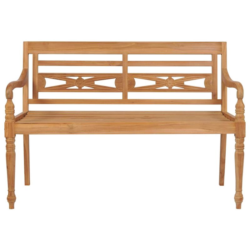 Тази удобна и елегантна дървена пейка Батавия добавя нотка на рустик чар към вашата градина или вътрешен двор. Тази мебел от тик е изработена от изключително издръжлива тикова твърда дървесина, която е суха – изсушена в пещ, а след това фино шлифована, за да ѝ се придаде много гладък вид. Тиковото дърво е известно с изключителната си здравина и устойчивост на атмосферни влияния, което го прави далеч по-подходящо за градински мебели от всеки друг вид дърво. Тиковата дървесина е идеалният избор, ако искате да закупите дълготрайна градинска мебел. Благодарение на шлайфаната повърхност, градинската пейка е устойчива на атмосферни влияния и лесна за почистване. При това е много подходяща за почивка или вечеря с приятели или роднини. Включената възглавница е практична и има декоративна функция. Максимално 110 кг на седалка. Съобразете се с риска от открит огън и други източници на силна топлина в близост до продукта.