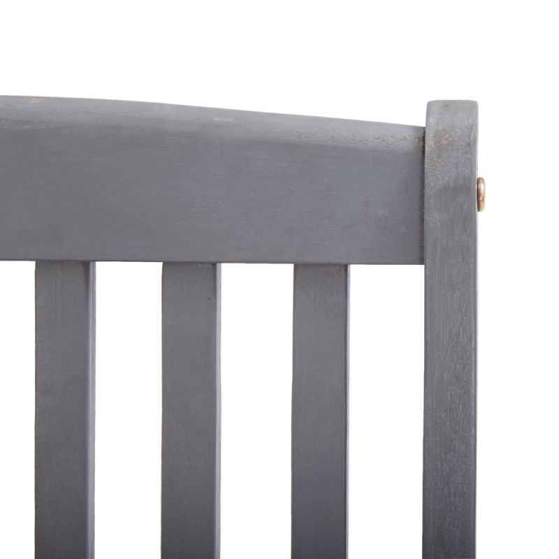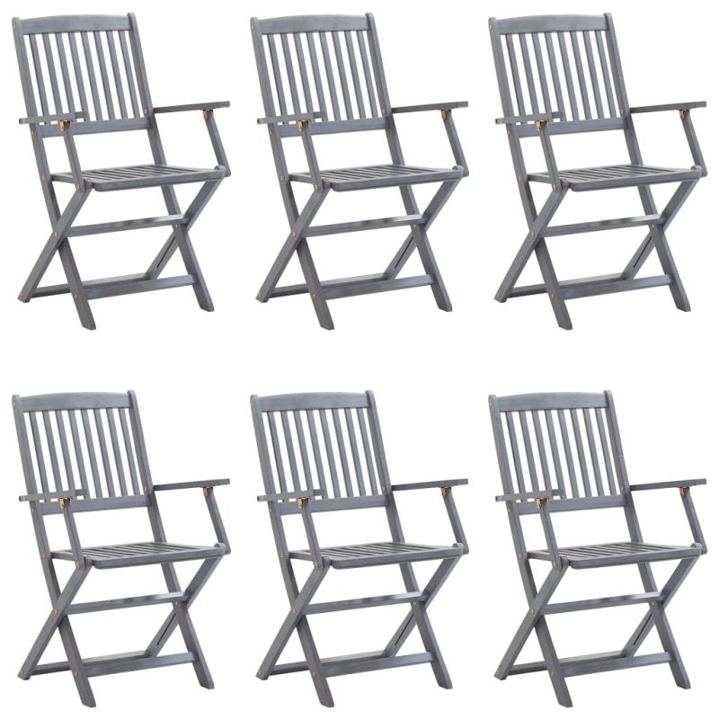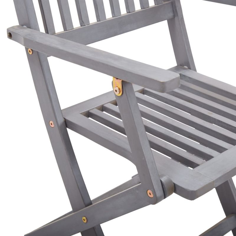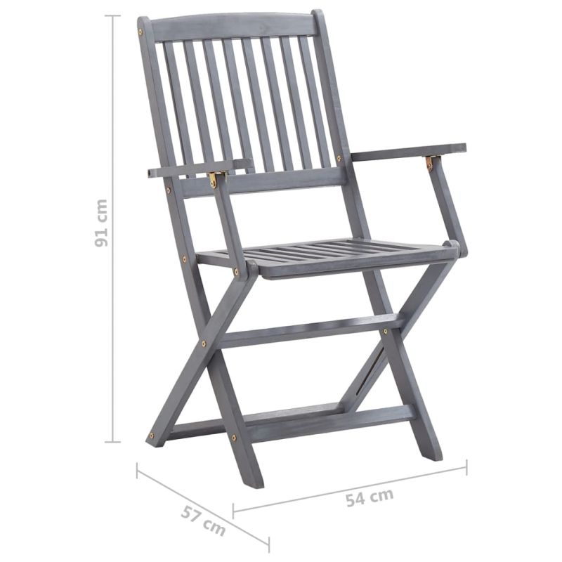 Този модерен комплект дървени трапезни столове с възглавници ще добави щрих на естествен стил към градината, терасата или вътрешния двор. Този комплект сгъваеми столове ще бъде чудесен избор за вечеря. Трапезните столове са изработени от масивно акациево дърво – тропическа твърда дървесина, която ги прави устойчиви на атмосферни влияния и издръжливи за дългогодишна употреба. Масивната акациева дървесина има силата да понесе тежестта и да издържи на износването на времето. Сивата избелена повърхност се почиства лесно с влажна кърпа. Столовете могат да се сгъват, за да пестят място, когато не се използват. Освен това включените възглавници осигуряват допълнителен комфорт при почивка или хранене. Всяка възглавница разполага с два комплекта връзки за плътно закрепване към стола. Максимално 110 кг на седалка.