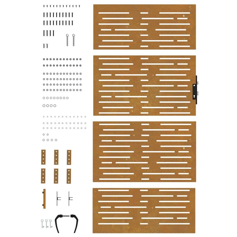 Тази градинска порта, отличаваща се с перфектна комбинация от здравина и елегантност, е идеална врата за оградата около вашата градина или вътрешен двор. Издръжлив материал: Металната врата е изработена от кортенова стомана. Кортенова стомана, известна също като патинираща стомана. Тя е антикорозионна по своята същност. Развива ръждив защитен слой срещу корозия при първото излагане на атмосферни условия. Следователно не е необходимо да я боядисвате. Това може да ви помогне да спестите разходи за поддръжка и ремонт. Отличителният кафяв цвят на кортеновата стомана със сигурност ще привлече вниманието. И накрая, патиниращата стомана е изключително издръжлива и ще издържи изпитанието на времето. Лазерно изрязан дизайн: Страничната порта има красив лазерно изрязан дизайн, който добавя специален чар към вашия дом.Заключваща се система: Стоманената порта е оборудвана със заключваща се система за допълнителна сигурност. Добре е да се знае:Този продукт трябва да бъде сглобен.Този продукт все още не е ръждясал и когато го получите ще има нормален метален цвят, но ръждата ще се появи с течение на времето. Можете да ускорите процеса на ръждясване, като го напръскате със сапунена и солена вода. За да запазите дрехите си от петна, избягвайте контакт с образуващия се слой ръжда. Не използвайте този артикул, ако някой от компонентите е счупен, скъсан или липсва.