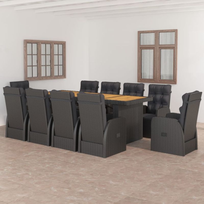 Градински комплект с възглавници, 11 части, полиратан, черен