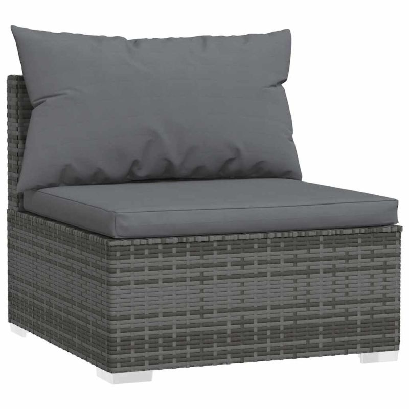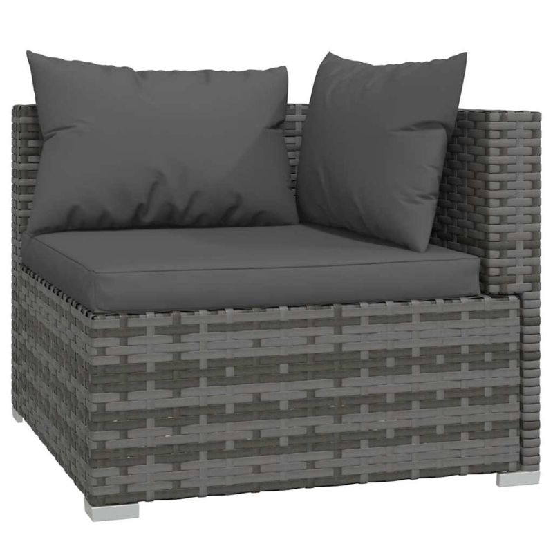 Отпуснете се и се насладете на свободното си време с този модерен градински лаундж комплект! Той е предназначен да отговори на различни ваши нужди. Здрава рамка: Този лаундж комплект за вътрешен двор се отличава със здрава прахово боядисана стоманена рамка и пластмасови хромирани крачета и е много издръжлив.Първокласен материал: Градинският комплект мека мебел е проектиран от водоустойчив PE ратан, което го прави лесен за почистване, издръжлив и подходящ за ежедневна употреба на открито.Модулен дизайн: Освен това модулният дизайн също дава възможност да поставите комплекта във всякаква аранжировка или да го комбинирате с други модулни сегменти, за да отговори на вашите нужди!Удобни възглавници за сядане и облягане: Дебело подплатените и подвижни възглавници за сядане и облягане осигуряват оптимален комфорт за вашето седене на открито. Забележка:Забележка: За да удължите живота на вашите градински мебели, ви препоръчваме да ги защитите с водоустойчиво покривало.