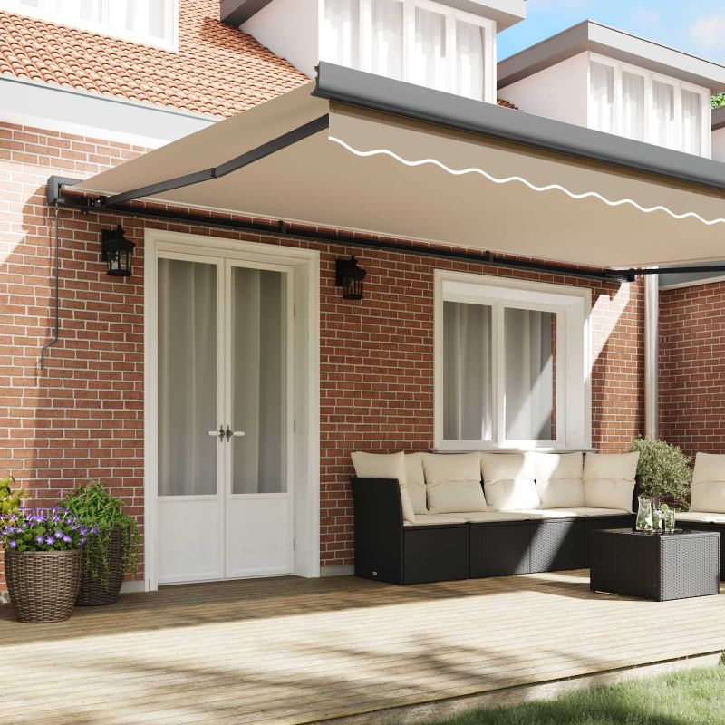 Този прибираем сенник съчетава простота и функционалност с модерен дизайн. Той е елегантно решение за сянка на слънцето в градината или на терасата, предлага универсално покритие с прибираемия си механизъм. Представете си стилна следобедна среща, защитена от силното слънце и неочаквани дъждове, чудесно съчетание на комфорт и открито, уловено в ефирна прибираща се структура. Модерен стил: Този елегантен прибираем сенник се вписва безупречно в всяко външно пространство. Централният му дизайн, заедно с минимализмa, предлага чиста визия, която ще направи пространството по-привлекателно. Идеален е за тези, които ценят изчистените линии и елегантността. Материални характеристики: Изработен от 100% полиестер, сенникът е дълготраен и много устойчив на UV лъчи и вода. Това го прави защитен от надвисналите атмосферни условия и невероятна инвестиция. Компоненти: С наличието на прибираем механизъм, той бързо преминава от разширено до затворено положение, осигурявайки сянка или открито пространство, когато е нужно. Проектиран е за надеждност и лесно управление. Инструкции за грижа: Защитете сенника си с покривало, когато не го ползвате, за да удължите живота му и да запазите привлекателността му. Изисквания за сглобяване: Доставя се като един прибираем сенник, сглобяването изисква двама души и основни инструменти. Процесът е прост, което ви позволява бързо да се насладите на продукта след инсталацията. Опасност! Силен отскок при отваряне. НЕ сваляйте това въже, освен ако не сте приключили с всички стъпки на сглобяване. Всички болтове трябва да са затегнати и елементът да е прикрепен към стената! Предупреждение! Внимавайте, когато разхлабвате рамената, защото те са под напрежение! Внезапното освобождаване на рамо на сгъваема тента може да причини нараняване. Внимание: Инструкциите за ползване трябва да бъдат прочетени преди употребата на продукта. Предупреждение: Работата в студени условия може да повреди продукта. Външна употреба в сгради и други строителни обекти.