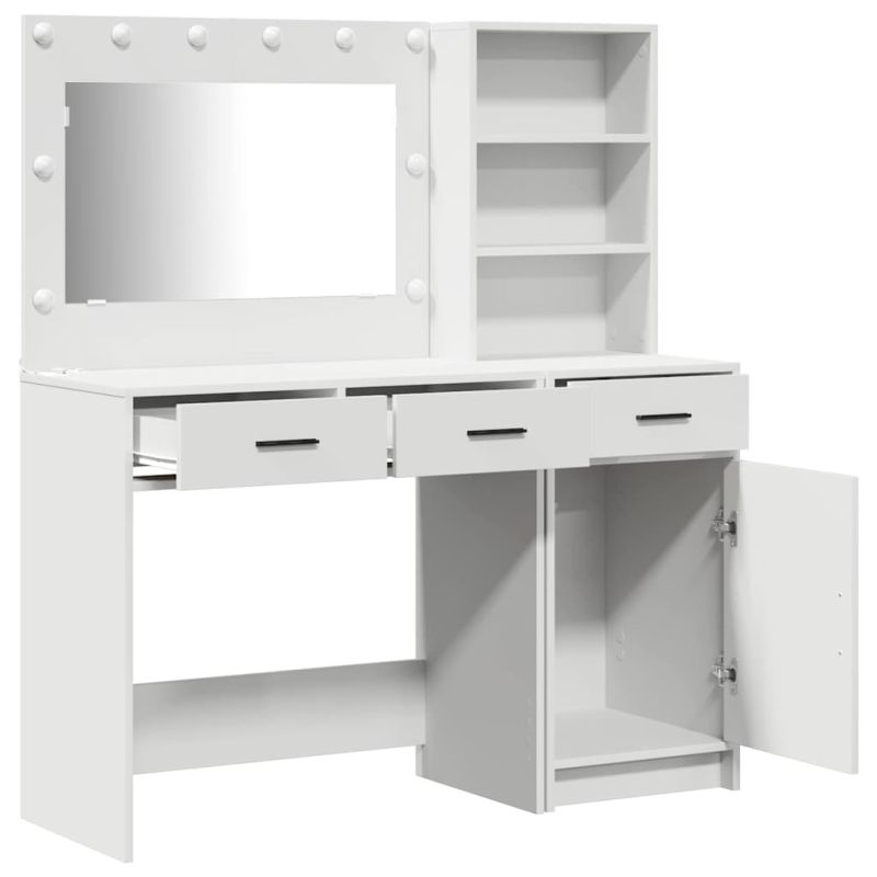 Тази елегантна тоалетка е чудесен начин да вкараш малко стил в спалнята си. С проста форма, тя съчетава елегантен вид с полезна структура, която предлага доста място за съхранение. Идеална за стандартна грижа, тоалетката е супер за всеки, който иска да добави модерен и минималистичен акцент в дома си. Нейният гладък и матов вид, заедно със симетричния дизайн, перфектно се вписват в съвременните домове.”]},{ Конструкция от инженерна дървесина Тоалетката е изработена от инженерна дървесина, осигуряваща здравина и модерен вид. Леката структура я прави лесна за преместване, а гладката повърхност е перфектна за ежедневно ползване. Ефикасни решения за съхранение С множество чекмеджета, тази тоалетка предлага доста място за организиране на козметика и аксесоари. Стилът на вратите позволява лесен достъп. Вградена LED осветление LED светлините в огледалото осигуряват отлично осветление за грим. С удобен бутон, те предлагат ярка видимост без сенки. Модерни бар дръжки Чекмеджетата се отварят и затварят лесно, а матовите бар дръжки добавят стил. Правоъгълна форма Дизайнът е универсален и лесно се вписва в различни спални планове. Моля, обърнете внимание, че трябва да използвате само сертифициран вход DC 5V. По-високото напрежение може да доведе до прегряване и да повреди устройството, както и до потенциален риск от прегряване и пожар. Не свързвайте този продукт към захранване, различно от описаното в ръководството, на табелката с името или изрично препоръчано от vidaXL. Този уред не трябва да се използва от деца под 15 години, както и от лица с намалени физически, сетивни или умствени способности или с липса на опит и познания относно използването на електронни уреди. Електричеството е опасно. Повредите и неправилният монтаж, употреба или промяна (подмяна на отделни компоненти) могат да доведат до повреда на уреда , което да доведе до токов удар и опасност за потребителя. Не използвайте този продукт във взривоопасна атмосфера, като например при наличие на запалими течности, газове и прах, или при температура над 50 градуса по Целзий или повече. Не включвайте продукта, ако свързващият кабел или захранването са видимо повредени. Ако външният гъвкав кабел или захранващ кабел на това осветително тяло е повреден, той трябва да бъде заменен изключително от производителя или негов сервизен агент, или от подобно квалифицирано лице, за да се избегне опасност. Изключете захранването по време на монтажа и поддръжката. Уверете се, че крушките са изстинали. Светлинният източник на това осветително тяло не може да се заменя; когато светлинният източник достигне края на експлоатационния си срок, цялото осветително тяло трябва да се замени. Само за употреба на закрито, не използвайте този продукт на открито.