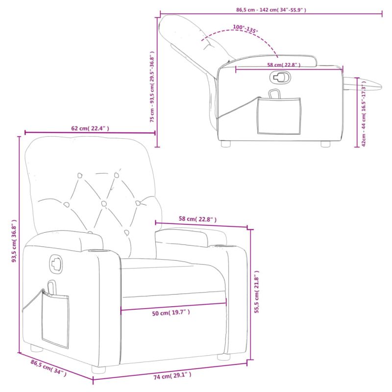Облегнете се и се отпуснете в този изключително комфортен масажен наклоняем стол! Функция за ръчно накланяне: Този накланящ се стол има дръжка от дясната страна. Можете ръчно да настроите поставката за крака и облегалката до произволна позиция според вашето удобство с просто издърпване на дръжката. Тази функция позволява максимален наклон от 135 градуса. Освен това облегалката може бързо да се върне на първоначалното си място с лесно издърпване на дръжката.Функция за вибрация: Представените 6 масажни точки ви позволяват да изпитате по-целенасочен масаж. Освен това включеното ръчно управление ви позволява да избирате различни програми за масаж. Функцията за масаж се захранва от USB конектора, но сертифицираният 5V USB източник на захранване не е включен.Удобно седене: Дебело подплатената седалка, облегалката и широките подлакътници, покрити с текстил, осигуряват уютно и топло усещане, което ви кара да се чувствате като в прегръдка, докато седите. Тъканта се отличава със семпъл и изчистен вид и е дишаща и издръжлива.Удобни поставки за чаши и страничен джоб: Този фотьойл разполага с две удобни поставки за чаши за вашите напитки и страничен джоб за вашето дистанционно управление или за поддържане на вашите основни вещи леснодостъпни.Здрава и стабилна рамка: Рамката, изработена от дърво и метал, осигурява здрава структура и стабилност. Този накланящ се фотьойл е удобен и издръжлив. Максимално 110 кг на седалка. Този продукт се захранва с DC 5V, но сертифицираният 5V USB източник на захранване не е включен в комплекта. По-високото напрежение може да доведе до прегряване на устройството и да доведе до повреда на устройството и потенциален риск от прегряване и пожар.