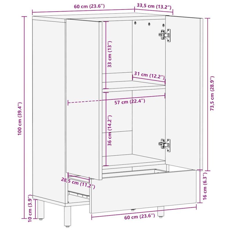 Този дървен висок шкаф има отличителен дизайн и ще добави нотка винтидж стил към вашия интериор. Масивна мангова дървесина: Масивната дървесина от манго е здрава тропическа дървесина, от която се произвеждат здрави мебели. Красивите ѝ дървесни шарки правят всяка мебел малко по-различна от следващите.Достатъчно място за съхранение: Този шкаф осигурява достатъчно място за съхранение на вашите списания, книги, DVD дискове, дистанционно управление и други дребни предмети, добре организирани и достъпни.Практичен дизайн: Бюфетът има отделения, които осигуряват достатъчно пространство за съхранение на организирани дрехи, книги или стъклария и др.С крака: Повдигнатите крачета улесняват почистването под шкафа, поддържат спретнат външен вид и осигуряват по-добър въздушен поток около електронното оборудване. Внимание:За да предотвратите преобръщане, този продукт трябва да се използва с предоставеното устройство за закрепване на стена. Добре е да се знае:Цветовете и шарките могат да варират от мебел до мебел, което прави всяка една уникална. Доставката е на случаен принцип, което гарантира ексклузивността и индивидуалността на вашия продукт.