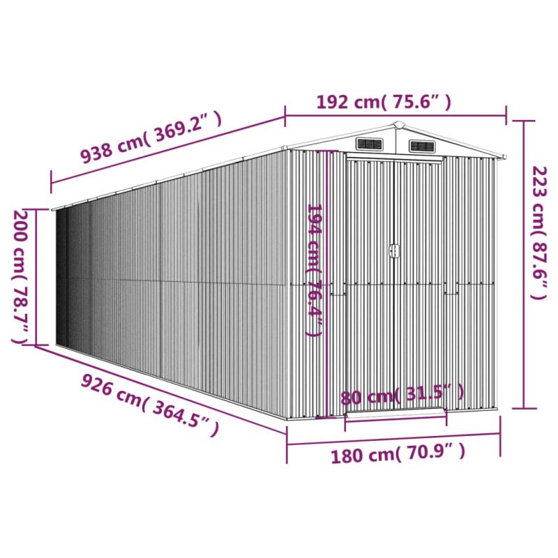 Градинска барака светлосива 192x938x223 см поцинкована стомана