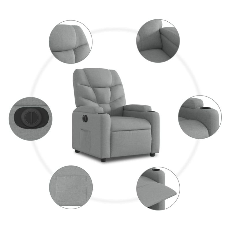 Облегнете се и се отпуснете в този изключително комфортен електрически изправящ наклоняем стол! Функция за повдигане: Този стол реклайнер е оборудван с електрически двигател с функция за повдигане. Благодарение на функцията, която избутва целия стол нагоре, можете лесно да стоите, без да натоварвате гърба и коленете си с просто натискане на бутона.Електрическа функция за накланяне: Този стол с облегалка също е оборудван с електрически мотор, който помага автоматично да регулирате поставката за крака и облегалката до произволна позиция според вашето удобство с просто натискане на бутона отстрани на стола. Тази функция позволява максимален наклон от 135 градуса. Освен това облегалката може да се върне автоматично на първоначалното си място с лесно натискане на бутона.Удобно седене: Дебело подплатената седалка, облегалката и широките подлакътници, покрити с текстил, осигуряват уютно и топло усещане, което ви кара да се чувствате като в прегръдка, докато седите. Тъканта се отличава със семпъл и изчистен вид и е дишаща и издръжлива.Удобни поставки за чаши и страничен джоб: Този фотьойл разполага с две удобни поставки за чаши за вашите напитки и страничен джоб, за да държите основните си вещи леснодостъпни.Здрава и стабилна рамка: Рамката, изработена от дърво и метал, осигурява здрава структура и стабилност. Този накланящ се фотьойл е удобен и издръжлив. Максимално 110 кг на седалка.Този уред може да се използва от деца на възраст от 8 години и повече и от лица с намалени физически, сетивни или умствени способности или с липса на опит и познания, ако са получили надзор или инструкции за безопасно използване на уреда и разбират свързаните с него опасности. Децата не трябва да си играят с уреда. Децата не трябва да почистват и да извършват потребителска поддръжка без надзор.