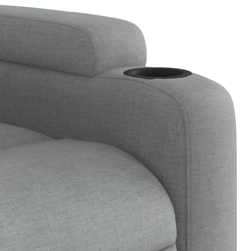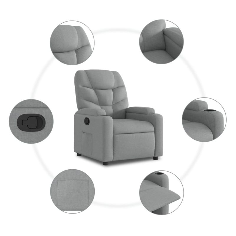 Отпуснете се и се потопете в този изключително удобен кресло-реклайнер! Функция за ръчно накланяне: Този кресло-реклайнер има дръжка от дясната страна. Можете ръчно да регулирате поставката за крака и облегалката във всяка позиция, според вашия комфорт, с едно просто издърпване на дръжката. Тази функция позволява максимален наклон от 135 градуса. Освен това, облегалката може бързо да се върне в първоначалното си положение с лесно издърпване на дръжката.Комфортно седене: Дебело подплатената седалка, облегалката и широките подлакътници, покрити с плат, осигуряват уютно и топло усещане, карайки ви да се чувствате прегърнати, докато седите. Платът е с изчистен вид, дишащ е и е издръжлив.Удобни поставки за чаши и страничен джоб: Този кресло има две удобни поставки за чаши за вашите напитки и страничен джоб, за да държите важните си вещи под ръка.Солидна и стабилна рамка: Рамката, изработена от дърво и метал, осигурява здрава структура и стабилност. Този кресло-реклайнер е удобен и издръжлив. Максимално 110 кг на седалка.
