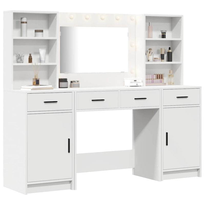 Този комплект за тоалетка е стилно допълнение към всяка спалня, съчетавайки мода и практичност. С размери 135 см височина и различна ширина и дълбочина, той е идеален за всяко пространство. Изработен от инженерно дърво за дълготрайност. Със своя чист и минималистичен дизайн, допълва различни интериорни стилове. Без значение дали се готвите за събитие или организирате вещите си, този комплект е идеален избор за елегантност и удобство. Конструкция от инженерно дърво Осигурява стабилна основа и дълготрайност. Издръжлив и устойчив на деформации, с гладко покритие, което му придава естетически вид. Акрилно огледало Устойчиво на счупване и по-леко от стъклените варианти. Проектирано за безопасност, осигурява висока яснота и остри отражения. Складова система с рафтове и чекмеджета Осигурява множество решения за съхранение. Улеснява организирането на козметични продукти, като спомага за чистота в пространството. LED осветление с натискане на бутон Предоставя ясна видимост, идеално за гримиране. Удобно включване с натискане на бутон, акцентира на функционалността на комплекта. Универсален модерен стил Лесно се вписва в разнообразни декори на спалнята. С чисти линии и прост дизайн, комбинира елегантност с полезност. Моля, обърнете внимание, че трябва да използвате само сертифициран вход DC 5V. По-високото напрежение може да доведе до прегряване и да повреди устройството, както и до потенциален риск от прегряване и пожар. Не свързвайте този продукт към захранване, различно от описаното в ръководството, на табелката с името или изрично препоръчано от vidaXL. Този уред не трябва да се използва от деца под 15 години, както и от лица с намалени физически, сетивни или умствени способности или с липса на опит и познания относно използването на електронни уреди. Електричеството е опасно. Повредите и неправилният монтаж, употреба или промяна (подмяна на отделни компоненти) могат да доведат до повреда на уреда , което да доведе до токов удар и опасност за потребителя. Не използвайте този продукт във взривоопасна атмосфера, като например при наличие на запалими течности, газове и прах, или при температура над 50 градуса по Целзий или повече. Не включвайте продукта, ако свързващият кабел или захранването са видимо повредени. Ако външният гъвкав кабел или захранващ кабел на това осветително тяло е повреден, той трябва да бъде заменен изключително от производителя или негов сервизен агент, или от подобно квалифицирано лице, за да се избегне опасност. Изключете захранването по време на монтажа и поддръжката. Уверете се, че крушките са изстинали. Светлинният източник на това осветително тяло не може да се заменя; когато светлинният източник достигне края на експлоатационния си срок, цялото осветително тяло трябва да се замени. Само за употреба на закрито, не използвайте този продукт на открито.
