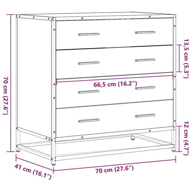 Търсите ли стилен шкаф с чекмеджета? Този добре проектиран шкаф с чекмеджета придава елегантен чар на съществуващия ви интериор! Стабилна и дълготрайна рамка: Металната рамка на шкафа за съхранение подчертава интериора ви с индустриален стил и осигурява изключителна издръжливост, стабилност и устойчивост на корозия.Стабилен и издръжлив материал: Инженерната дървесина е издръжлив и стабилен материал с гладка повърхност, която е устойчива на влага, изкривяване и разцепване, което я прави надежден избор за различни проекти.Голямо пространство за съхранение: Този скрин с 4 големи чекмеджета осигурява достатъчно място за съхранение, за да държите различните си ежедневни принадлежности добре организирани и леснодостъпни.Здрав плот: Здравият плот е идеалното място за нареждане на саксийни растения, снимки в рамки и други декоративни елементи.Лесна за почистване повърхност: Скринът се почиства лесно с влажна кърпа. Внимание:За да предотвратите преобръщане, този продукт трябва да се използва с предоставеното устройство за закрепване на стена.