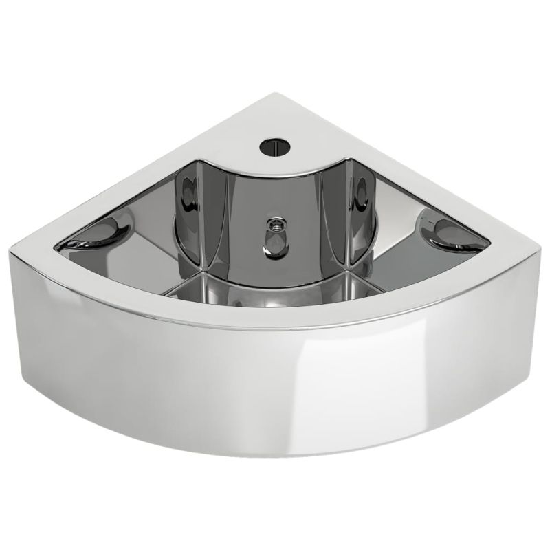 Изработена от керамика, тази ъглова мивка ще бъде изискано и непреходно допълнение към всяка баня, тоалетна, гримьорна или дамска тоалетна. Умивалникът може да служи не само като аксесоар за ежедневна употреба, но и за украса на жилището ви. Благодарение на модерния и съвременен дизайн със сребрист лъскав цвят, тази мивка определено ще подхожда на всеки интериор. Изработена от керамика, тя се почиства сравнително лесно. В допълнение гланцираната повърхност придава очарователен щрих на тази мивка за баня. Снабдена с преливник, водата в тази мивка ще изтича ефективно, когато се препълни. Мивката има отвор за поставяне на смесител. Моля, отбележете, че смесителният кран и сифонът не са включени в доставката.