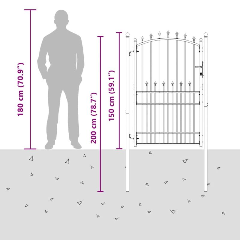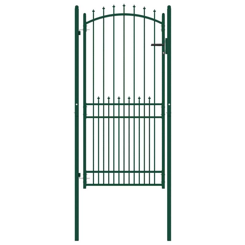 Тази оградна порта формира практична защитна преграда за вашата градина, вътрешен двор или тераса. Произведена от устойчива стомана, оградната порта има здрава конструкция и е прахово боядисана срещу ръжда и корозия. С вертикалните пръти с шипове и стабилната хоризонтална скоба като армировка тази градинска порта осигурява висока степен на сигурност. Дъгообразният дизайн на горната част допринася за нейната елегантност. Предлага се с два солидни пръта и здрави панти за лесен монтаж, а в доставката е включена и заключваща система с три ключа.