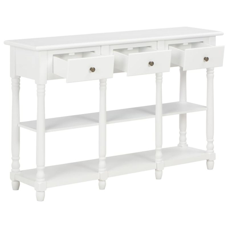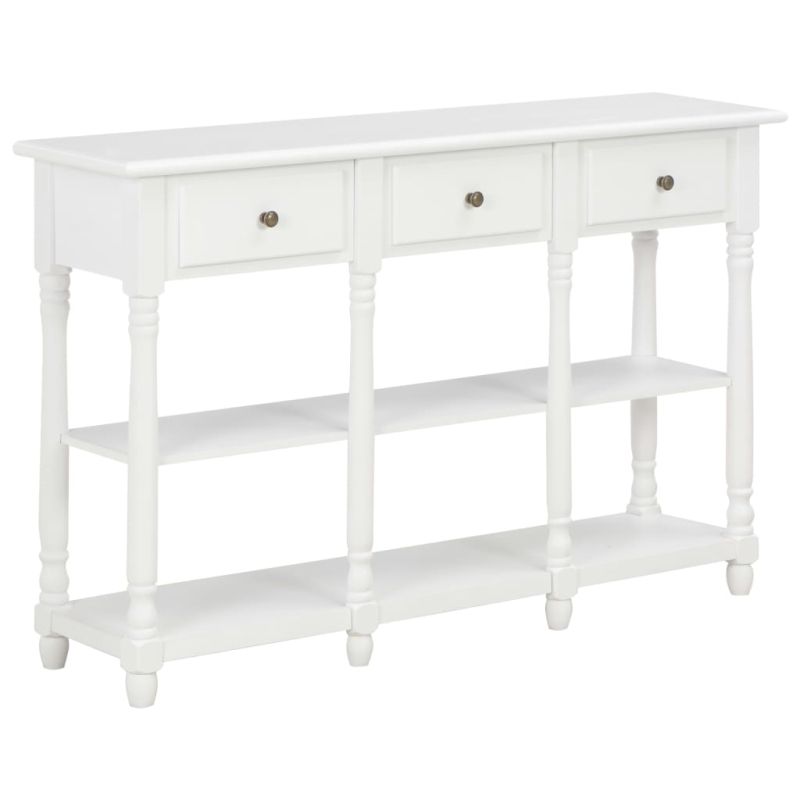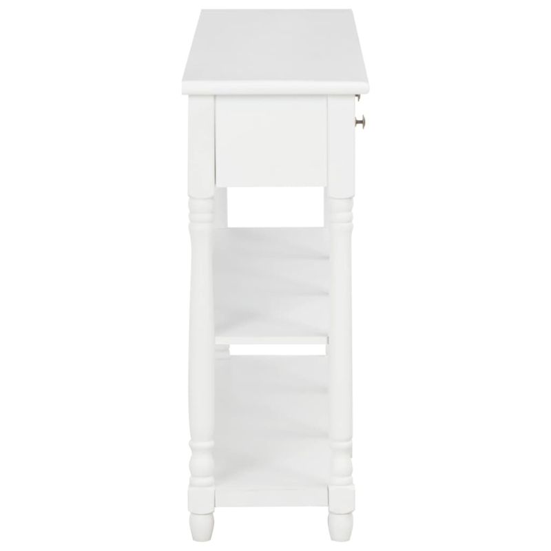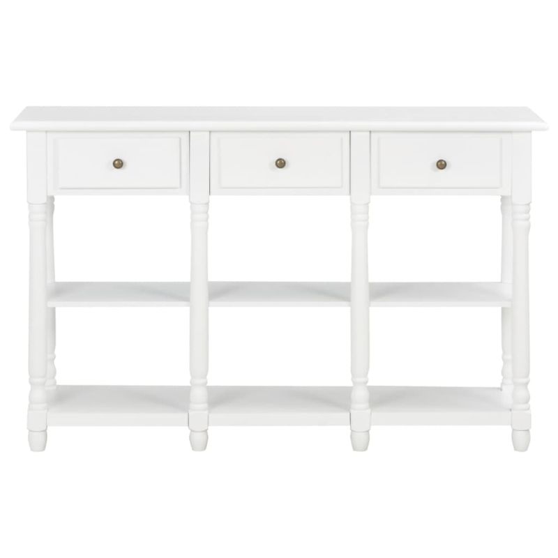 Гъвкавият дизайн на тази класическа конзолна маса добавя елегантност и място за съхранение към вашето антре, всекидневна или коридор. Издръжлив материал: Масата е изработена предимно от инженерно дърво. Инженерната дървесина е с изключително качество с гладка повърхност и също така се отличава със здравина, стабилност и устойчивост на влага.Стабилни крака: Краката са изработени от масивна борова дървесина, осигуряваща здравина и стабилност.Достатъчно място за съхранение: Конзолната маса е оборудвана с 3 чекмеджета и 2 рафта за съхранение на вашите ключове, карти, очила или някои често използвани предмети, когато излизате.Просторен плот: Тази странична масичка разполага с просторен плот, който ви осигурява идеалното пространство, с което да подчертаете вашите важни вещи, като декоративни предмети, ваза с цветя, снимки в рамки и др. Внимание:За да се предотврати преобръщане, този продукт трябва да се използва с предоставената приставка за стена.