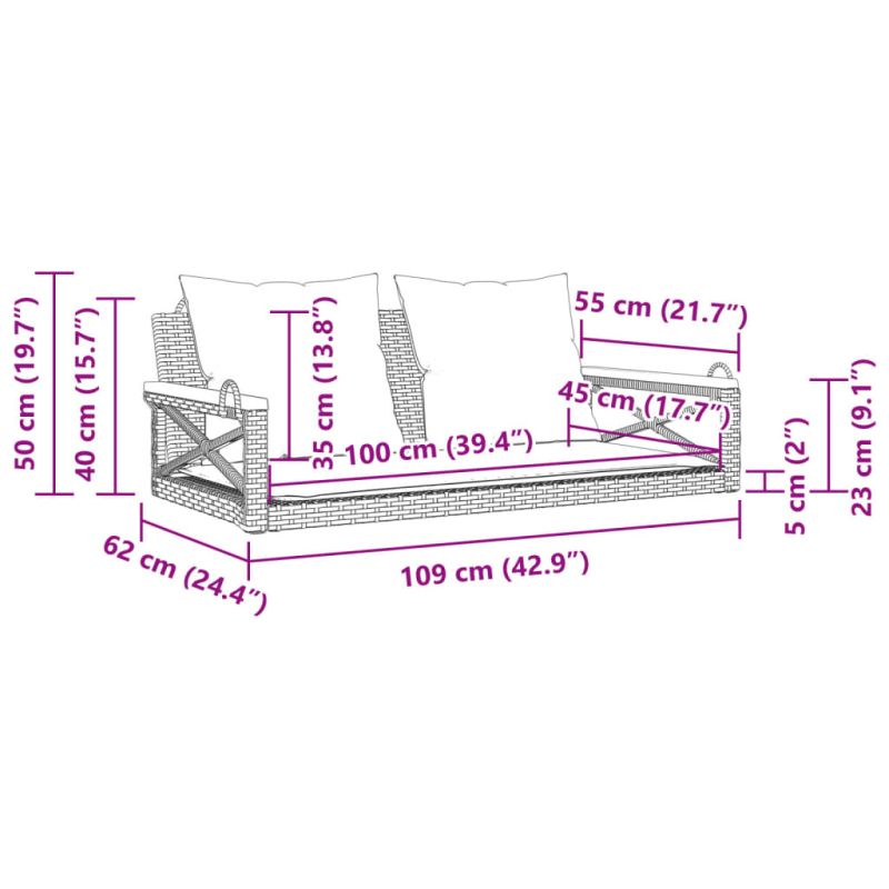 Тази пейка-люлка с възглавници е идеалният избор, ако търсите релаксация и удоволствие на открито. Издръжлив материал: PE ратан, известен също като полиратан, е здрав синтетичен материал с малко необходима поддръжка, който прилича на естествен ратан. Той е лек, лесен за почистване и често се използва за външни мебели поради своята издръжливост и устойчивост на атмосферни влияния.Удобна седалка: Тази мебел за открито, снабдена с плътно подплатени възглавници, предлага удобство при сядане.Люлееща функция: Изпитайте върховната релаксация, докато се люлеете леко под бриза на висящата пейка с нейната функция люлеене.Практични фиксиращи пръстени: Външната мебел е оборудвана с фиксиращи пръстени, което я прави удобна за окачване на големи дървета, стойки и други здрави предмети.Здрава и стабилна рамка: Стоманената рамка с прахово покритие гарантира, че градинската мебел е здрава и стабилна за ежедневна употреба на открито. Добре е да се знае:За да сте сигурни, че вашите външни мебели ще останат красиви, ви препоръчваме да ги защитите с водоустойчиво покривало.Доставката включва само пейка за люлка. Рамката за люлка и висящите вериги не са включени.