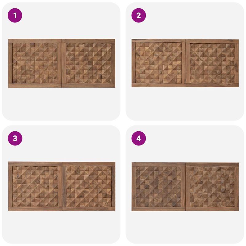 Тази таблица комбинира елегантност и практичност, изработена от солидна тикова дървесина, която придава селски чар на спалнята. С правоъгълната си форма, тя служи не само като красиво поле за леглото, а и като акцент. Дизайнът й е вдъхновен от уютния, селски стил, което я прави перфектен избор както за традиционни, така и за модерни интериори. Нейните естествени цветове се вписват лесно в различни декори, предлагаща универсалност и вечен стил. Солидна тикова дървесина: Направена от масивен тик, известен с издръжливостта и устойчивостта на влага. Виждайки уникалната текстура на тика, добавя уют и топлина в интериора. Здравата конструкция осигурява дълготрайност и стилен вид. Монтирани стенни скоби: Таблата спестява място на пода и придава изчистен вид. С включените скоби и болтове, монтирането е лесно и надеждно. Идеална е за по-малки стаи с организиран вид. 3D ефект: Придава дълбочина и измерение на пространството. Визуалният акцент е привлекателен и допълва сложността на интериорния дизайн. Селски и фермерски стил: Подчертава естествената красота с груби и фини елементи, създавайки уютна атмосфера в спалнята. Лесна инсталация: Инсталацията е проста и бърза. Инструкциите улесняват монтажа, осигурявайки сигурно присъствие в стаята.