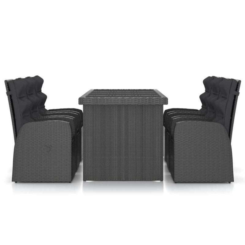Този комплект за хранене на открито, с елегантен и съвременен дизайн, е привлекателно допълнение към вашето външно жилищно пространство. Комплектът градински мебели има здрава прахово боядисана стоманена рамка, която е много стабилна и издръжлива. PE ратанът прави трапезния комплект лесен за почистване, устойчив и подходящ за ежедневна употреба на открито. Стъкленият плот на масата също се почиства лесно с влажна кърпа. Накланящите се столове предлагат пълен комфорт при седене и страхотна опора. Облегалката може да се регулира лесно според желанието ви с помощта на страничния бутон. При това плътните и меки възглавници за облягане са също изключително удобни. Забележка: Препоръчваме да покривате комплекта при дъжд, сняг и скреж за удължен експоатационен живот. Максимално 110 кг на седалка. Съобразете се с риска от открит огън и други източници на силна топлина в близост до продукта.