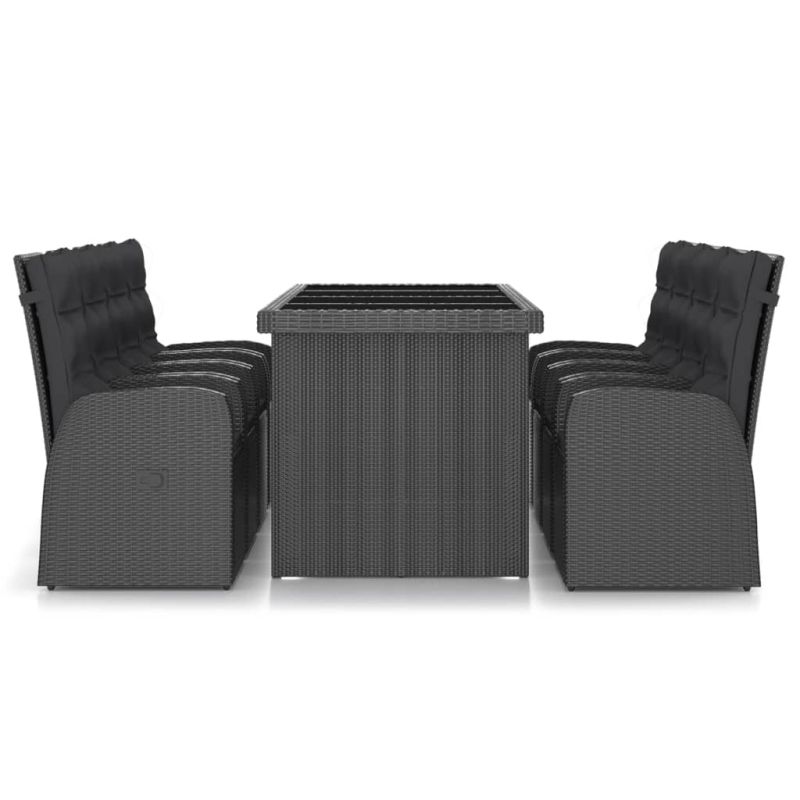 Този комплект за хранене на открито, с елегантен и съвременен дизайн, е привлекателно допълнение към вашето външно жилищно пространство. Комплектът градински мебели има здрава прахово боядисана стоманена рамка, която е много стабилна и издръжлива. PE ратанът прави трапезния комплект лесен за почистване, устойчив и подходящ за ежедневна употреба на открито. Стъкленият плот на масата също се почиства лесно с влажна кърпа. Накланящите се столове предлагат пълен комфорт при седене и страхотна опора. Облегалката може да се регулира лесно според желанието ви с помощта на страничния бутон. При това плътните и меки възглавници за облягане са също изключително удобни. Забележка: Препоръчваме да покривате комплекта при дъжд, сняг и скреж за удължен експоатационен живот.