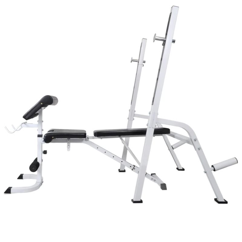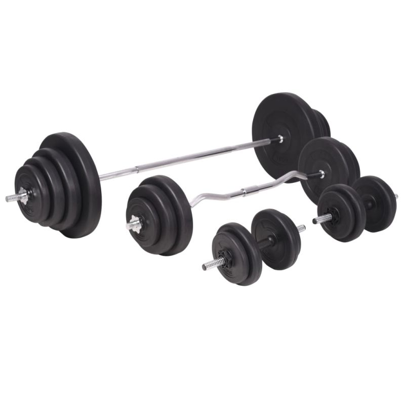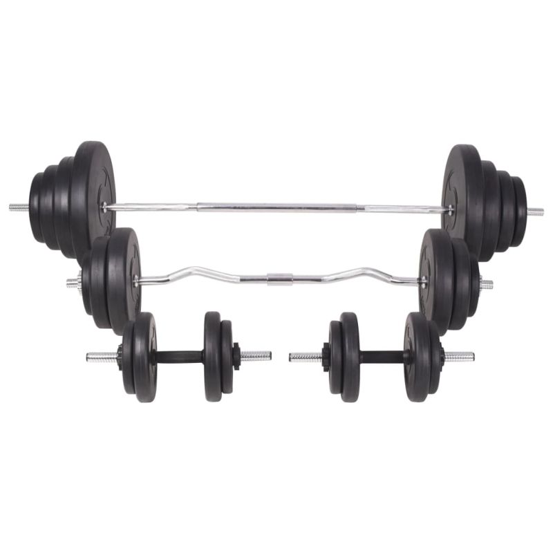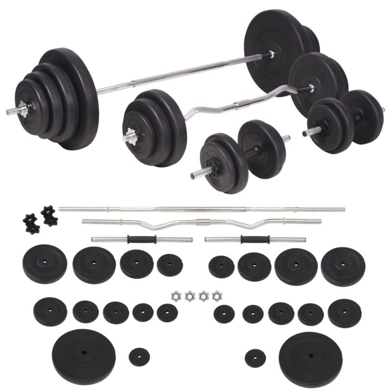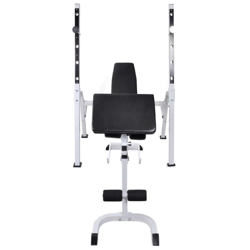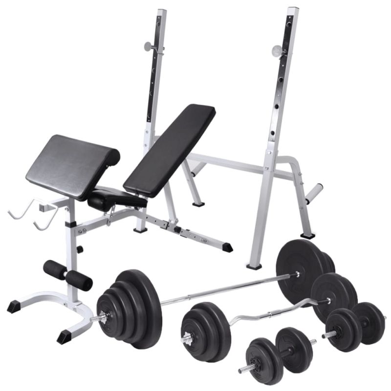 Тази регулируема лежанка с тежести и комплект щанга и дъмбели е чудесен избор за тренировка в уюта на собствения ви дом, която ще ви спести време и разходи от посещението на фитнес зали. Тази лежанка предлага широка гама от възможности за упражнения. Облегалката ще укрепи мускулите на гърба ви. Благодарение на опорната възглавничка с извивки за ръцете, можете да упражнявате ръцете си. Широката гама тренировъчни комбинации и упражнения дава възможност за ефективна, пълна тренировка на тялото, докато регулируемите нива позволяват адаптиране на тренировката според вашите специфични нужди. Здравата стоманена конструкция на пейката осигурява вашата безопасност по време на упражненията. Издръжливата подплатена с памук възглавница ще ви предложи максимален комфорт. Този многофункционален комплект с щанга и дъмбели е идеален за гръдния кош, бицепса, ръцете, трицепсите и мускулите на гърба. Той включва две тежести от 15 кг, две тежести от 10 кг, две тежести от 7,5 кг, четири тежести от 5 кг, шест тежести от 2,5 килограма, шест тежести от 1,25 килограма, два лоста за щанги и два дъмбела - всичко с общо тегло около 120 кг. Този комплект позволява на потребителите да избират вариращо тежестите, които искат да вдигнат за различни упражнения. Тези тежести са изработени от цимент с пластмасова обвивка и лесно могат да бъдат закрепени върху лоста с включените звездообразни гайки. Теглото е ясно щамповано върху всяка плоча за бързо и лесно идентифициране.