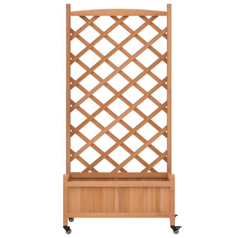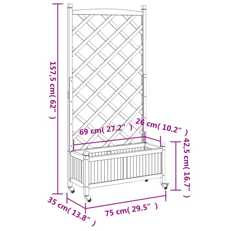 Тази дървена кашпа с пергола и колелца е отличен избор за увивни растения във вашата градина, вътрешен двор и тераса. Масивна ела: Масивната ела е красив и издръжлив материал, който запазва целостта си дори когато е изложен на влага. Не изсъхва и не се деформира, което я прави надежден избор.Достатъчно пространство: Тази градинска кашпа е достатъчно широка и дълбока, осигурявайки достатъчно място за отглеждане на различни растения, цветя и зеленчуци. В допълнение, кухото дъно позволява добра вентилация и дренаж.Решетъчен ограден панел: Плантерът за вътрешен двор се предлага с красив решетъчен ограден панел, който е идеален за поддържане на увивни и висящи растения като рози, бръшлян или лози. Той също така добавя зашеметяваща визуална функция към вашето външно пространство.Удобни колела: Солидното колело помага за лесното местене на вашата кашпа, когато колелото е прикрепено.Широки приложения: Тази кашпа за открито е проектирана с кръгла горна лента, която ѝ придава стилен и елегантен външен вид, който допълва всяко външно пространство. Може да се постави в ъгъла на вътрешния двор или да се облегне на стена или ограда. Добре е да се знае:Доставката включва само кашпата; вложката не е включена.